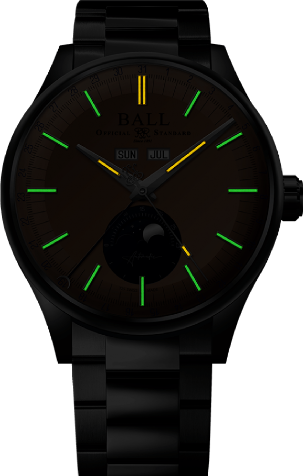 Funkce:Čas, datum, den v týdnu, měsíční fáze, strojek Swiss Ball calibre RR1807 (základ swiss Eta 2824-2) - rezerva chodu 42 hodin, automatický nátah (hodinky se natahují pohybem ruky) + ruční nátah (hodinky lze natáhnout/dotáhnout dle potřeby i ručně korunkou), 28.800 polokmitů setrvačky za hodinu - přesnost chodu 2 - 4 vteřiny/den, 25 kamenových uložení, šroubovací vodotěsná korunka,odolnost vůči magnetickému poli 4 800 A/m (takto označené hodinky už se označují jako antimagnetické, odolávají běžnému magnetickému poli),odolnost nárazu 5 000 Gs = možný pád hodinek až z jednoho metru bez poškození strojku (hodinky jsou tímto zároveň odolné podobným nárazům identické síly), články v náramku jsou spojovány šroubky (jedno z nějkvalitnějších spojení zaručující velmi dlouhou životnost náramku)