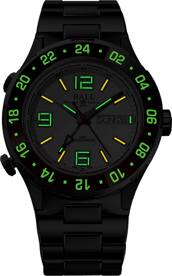 Funkce:Čas, datum, den v týdnu, GMT - druhé světové pásmo, obousměrně otočná keramická luminisceční luneta (číslice/indexy na lunetě v noci svítí - SuperLuminova), strojek Ball calibre RR1203 - C (základ swiss Eta 2824) - rezerva chodu 38 hodin, automatický nátah (pohybem ruky) + ruční nátah (hodinky lze natáhnout i mechanicky - ručně), 28.800 polokmitů setrvačky za hodinu, COSC certifikát přesnosti strojku - přesnost chodu 0 - 3 vteřiny/den, 25 kamenových uložení, šroubovací vodotěsná korunka, odolnost vůči magnetickému poli 4 800 A/m (takto označené hodinky už se označují jako antimagnetické, odolávají běžnému magnetickému poli), odolnost nárazu 5 000 Gs = možný pád hodinek až z jednoho metru bez poškození strojku (hodinky jsou tímto zároveň odolné podobným nárazům identické síly), články náramku jsou spojovány šroubky (velmi kvalitní spojení), zadní víčko pouzdra hodinek je prosklené pro náhled na strojek. V číselníku jsou indexy a ručičky plněny mikroampulkami se svítícím plynem, který má schopnost svítit nonstop 25 let. Díky tomu uvidíte kdykoliv a kdekoliv ve tmě, jaký je správný čas