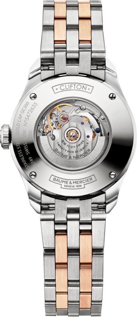 Funkce:Čas, datum, strojek swiss ETA 2671 - rezerva chodu 38 - 42 hodin, kmity setrvačky 28.800/h = diference 3 - 4 vteřiny denně, luneta pouzdra je zlatá (ryzost zlata 18 karátů), v náramku se též kombinuje ocel (stříbrná) a zlato (masiv), průhledné zadní víčko pro náhled na strojek. Firma Baume et Mercier Vám vyrobí na zakázku kožený řemínek ke každým hodinkám své produkce, který si vyberete z palety jejich vzorníku (modrý, modrý s bílým prošitím, modrý s modrým prošitím, modrý s béžovým prošitím a takto i další barvy kůže - viz.obrázek ve fotkách hodinek). Baume et Mercier je natolik prestižní firma, že opraví každé hodinky, které vyrobili od počátku svého vzniku, tedy od roku 1830. Baume & Mercier si vyrábí svoje vlastní hodinářské oleje, které vynikají svojí dlouhou životností - díky tomu je prodloužena doba pravidelného celkového servisu(vyčištění a namazání strojku) na 10 let.