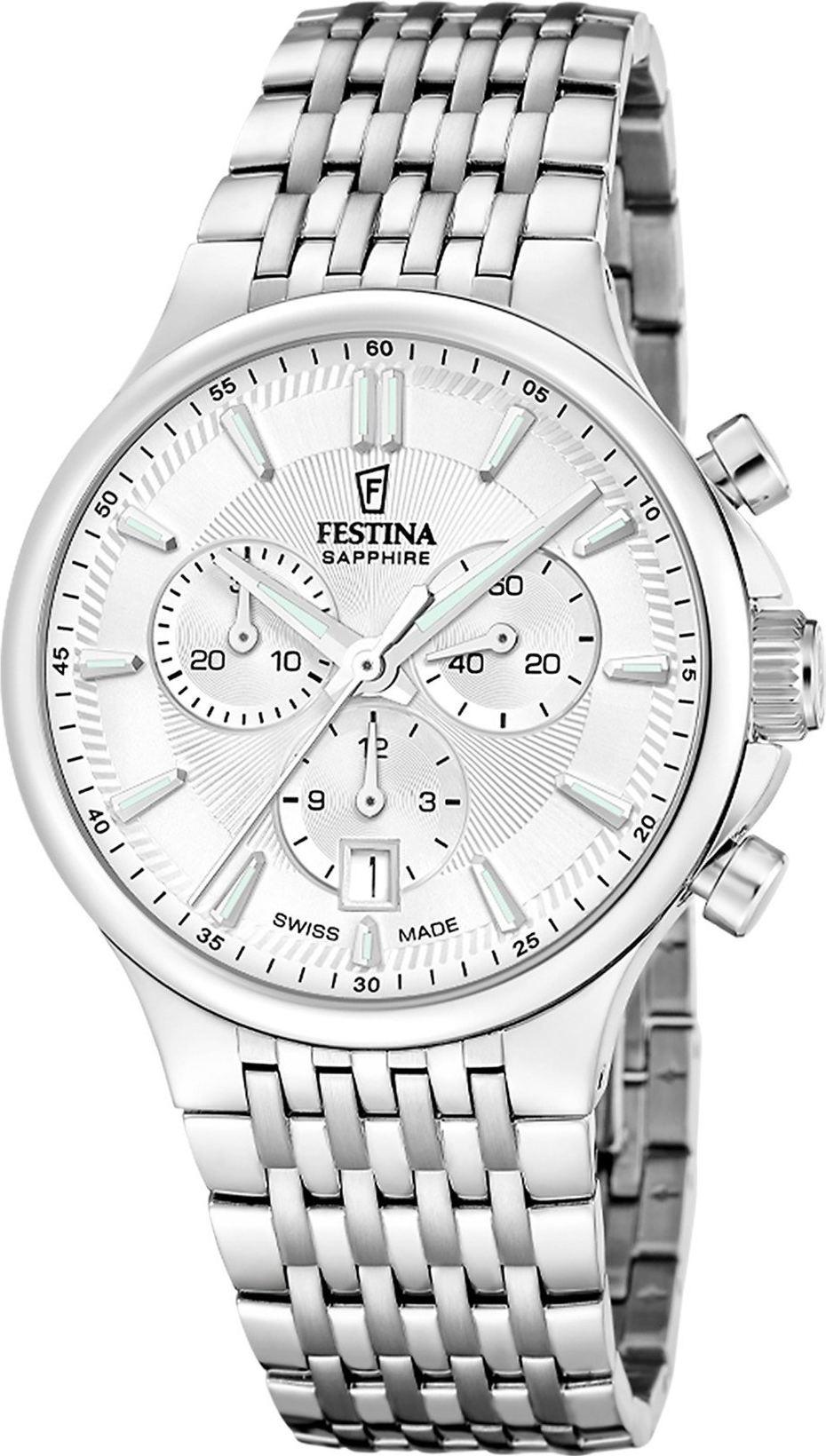 Funkce:Čas, datum, stopky, švýcarský quartzový strojek Ronda 5030.D, luminiscenční ručky a indexy,