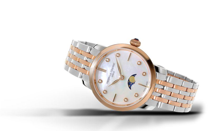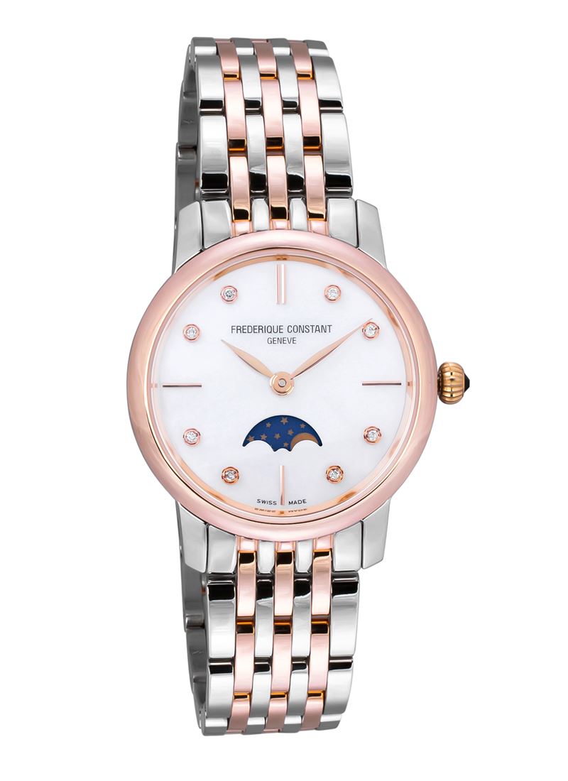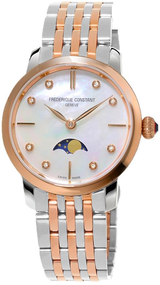 Funkce:Čas, fáze měsíce, quartzový strojek FC-206, přesnost chodu 0 - 0,5 s/den, číselník zdobí 8 diamantů o váze 0,04 karátů