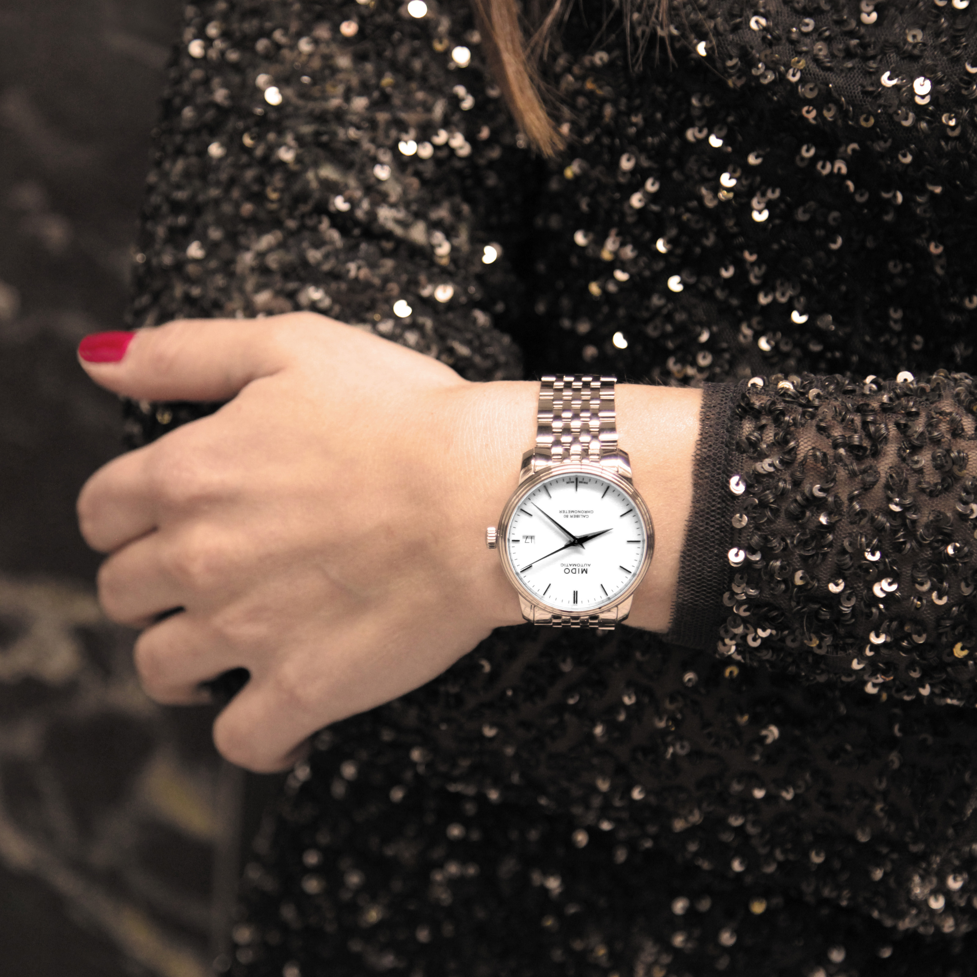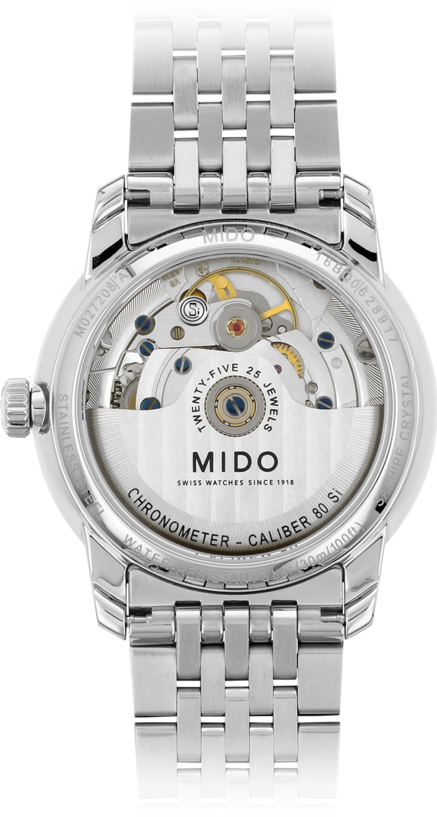 Funkce:Čas, datum, strojek swiss Mido caliber 80.821 COSC (Eta C07.821) - rezerva chodu 80 hodin, polokmity setrvačky 21.600/h (nižší polokmity jsou vyladěny na nejvyšší možnou přesnost strojku jemnou regulací na věnci setrvačky + další úpravy stroje na vyšší přesnost pro certifikaci COSC) = přesnost chodu 0 - 3 vteřiny denně, Si křemíkový vlásek - dlouhodobá přesnost strojku (lepší odolnost proti nárazům a lepší anti-magnetické vlastnosti), 25 kamenných uložení, průhledné zadní víčko pro náhled na strojek, ozdobně lapovaný rotor samonátahu, automatický nátah (pohyb ruky) + ruční nátah (hodinky lze také natahovat i korunkou)