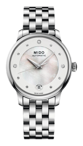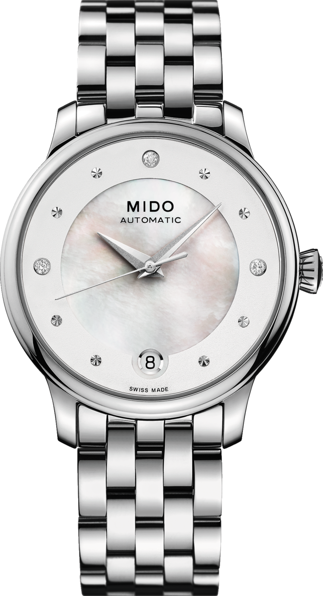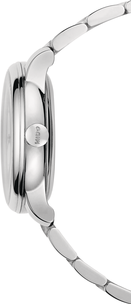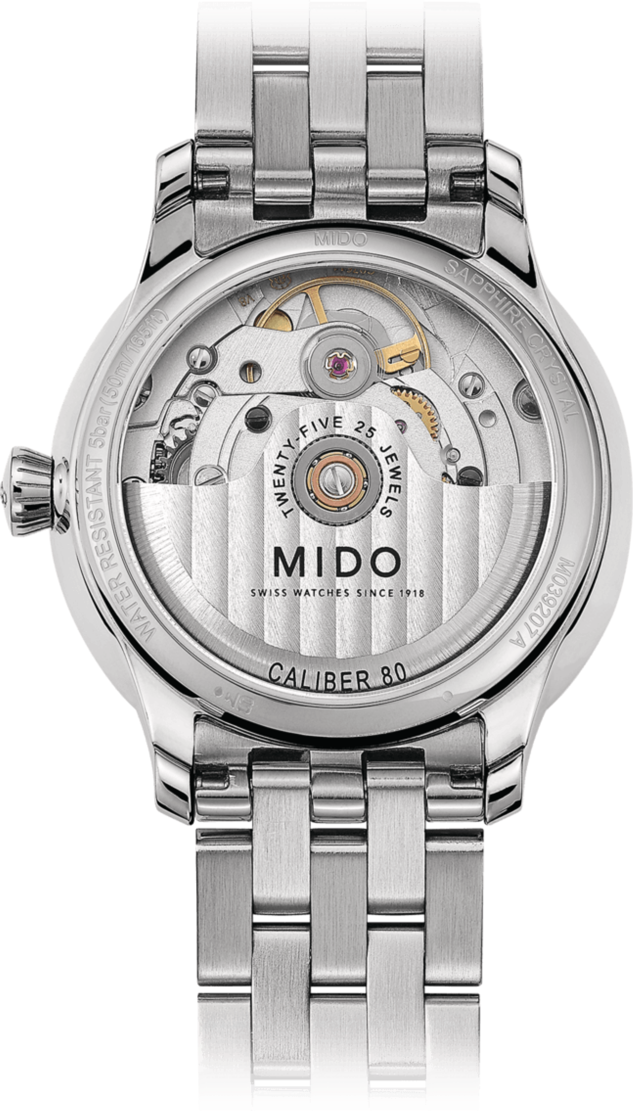 Funkce:Čas, datum, strojek swiss Mido caliber 80.611 - vyráběn firmou Eta exklusivně pro Mido = 25 kamenů (krokové ústrojí ocel/kámen), rezerva chodu 80 hodin, polokmity setrvačky 21.600/h = přesnost chodu 3 - 5 vteřin denně (nižší polokmity setrvačky jsou vyladěny jemnou regulací na věnci setrvačky pro maximální přesnost strojku), ozdobně lapovaný rotor, automatický (pohyb ruky) + ruční nátah (hodinky lze také natahovat i korunkou), průhledné zadní víčko pro náhled na strojek, zapínání náramku - překlapávací spona (pevné praktické zapínání), číselník zdobí 3 diamanty o váze 0,051 karátů