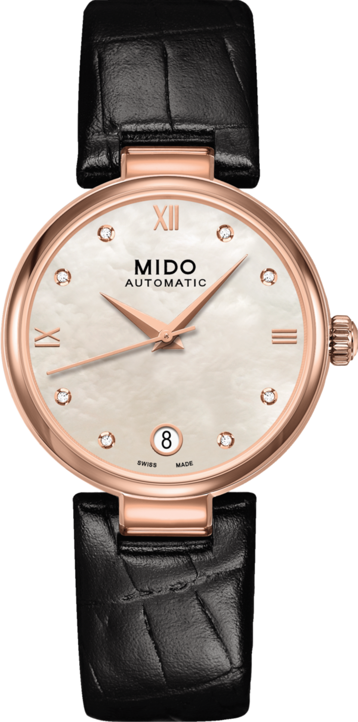 Funkce:Čas, datum, strojek swiss Mido caliber 80.611 - vyráběn firmou Eta exklusivně pro Mido = 25 kamenů (krokové ústrojí ocel/kámen), rezerva chodu 80 hodin, polokmity setrvačky 21.600/h = přesnost chodu 3 - 5 vteřin denně (nižší polokmity setrvačky jsou vyladěny jemnou regulací na věnci setrvačky pro maximální přesnost strojku), ozdobně lapovaný rotor, automatický nátah (pohyb ruky) + ruční nátah (hodinky lze také natahovat i korunkou), průhledné zadní víčko pro náhled na strojek, zapínání náramku - překlapávací spona (pevné praktické zapínání), ozdobně lapovaný rotor samonátahu, číselník zdobí 8 diamantů o váze 0,040 karátů