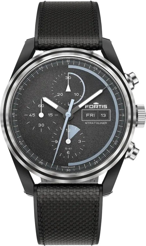 Fortis Stratoliner S-41 Gravity Black F2340018 jsou technicky ostře pojaté švýcarské automatické hodinky s chronografem, které zaujmou temným provedením, moderním sportovním výrazem a jasně nástrojovým charakterem. Tato reference stojí na černém číselníku Gravity Black a na černém hybridním řemínku, což vytváří mimořádně kompaktní a velmi sebevědomý celek. Oproti světlejším a barevnějším verzím Stratolineru působí Gravity Black tvrději, techničtěji a moderněji. Fortis zde pracuje s černou velmi disciplinovaně, takže model nepůsobí samoúčelně agresivně, ale naopak čistě a funkčně. Průměr 41 mm dává hodinkám výraznou přítomnost na ruce a současně zachovává velmi dobrou každodenní nositelnost. Černá DLC úprava pouzdra navíc reference jednoznačně odlišuje od běžných ocelových variant a posouvá její vizuální identitu do současnější roviny. Fortis Stratoliner S-41 Gravity Black F2340018 tak osloví muže, kteří chtějí chronograf s kosmickým odkazem, moderním technickým vzhledem a současně velmi pohodlným sportovním řemínkem.