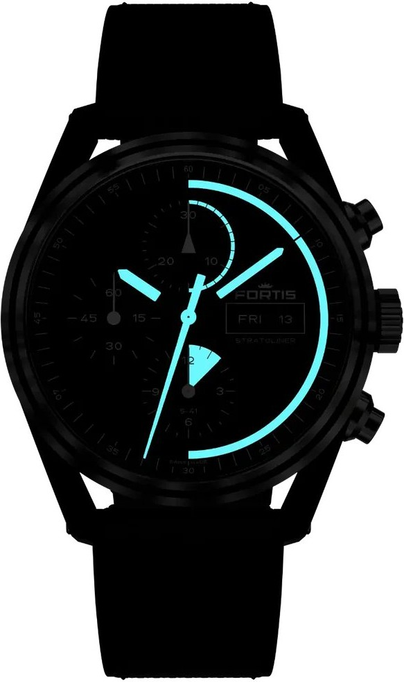 Uvnitř modelu pracuje manufakturní mechanický strojek Werk 17 s automatickým nátahem. Tento kalibr je řešen jako sloupkový chronograf, což zvyšuje kvalitu ovládání stopek a potvrzuje vyšší hodinářskou úroveň celé reference. Werk 17 disponuje rezervou chodu 60 hodin, funkcí hackingu a možností ručního nátahu. Samozřejmostí je také ukazatel data a dne v týdnu, takže model není jen efektním sportovním chronografem, ale i velmi praktickým partnerem pro každodenní nošení. Fortis u řady Stratoliner uvádí testování ve stratosféře, což velmi dobře podtrhuje technickou filozofii této kolekce. U reference Gravity Black je právě kombinace tmavé moderní estetiky a vyspělého manufakturního kalibru jedním z hlavních důvodů, proč model působí tak přesvědčivě. Nejde o designovou hříčku s černou barvou, ale o plnohodnotný mechanický chronograf s vysokou hodinářskou hodnotou a technickou důvěryhodností.