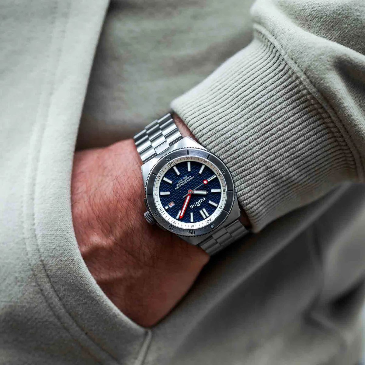 Pouzdro je vyrobeno z ušlechtilé nerezové oceli a má průměr 40 mm a tloušťku 12 mm. Tyto rozměry působí velmi vyváženě a činí z hodinek model, který je robustní, ale stále velmi dobře nositelný. Konstrukci doplňuje jednosměrně otočná luneta s minutovou stupnicí, která je důležitým funkčním prvkem každých skutečných potápěčských hodinek. Šroubovací korunka podporuje vysokou odolnost a potvrzuje technický charakter celé reference. Modro-bílý číselník Blue Japan je zde hlavní vizuální zvláštností a v kombinaci se stříbrným pouzdrem vytváří velmi výrazný, ale stále profesionální celek. Fortis zde velmi dobře pracuje s barvou i kontrastem, takže přehlednost zůstává na vysoké úrovni. Na ruce působí model svěže, sebevědomě a technicky čistě. Jde o hodinky, které se odlišují, ale ne za cenu ztráty funkční disciplinovanosti, což je pro kvalitní sportovní model této třídy zásadní.