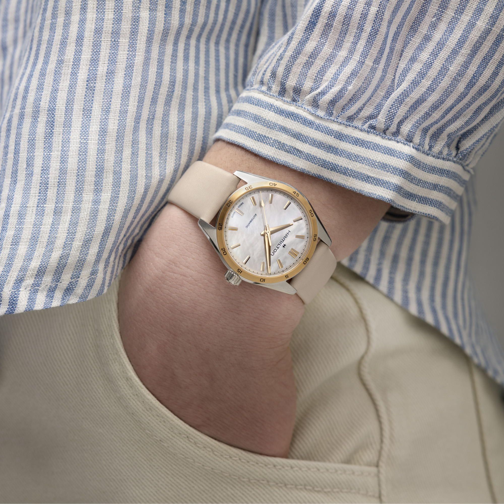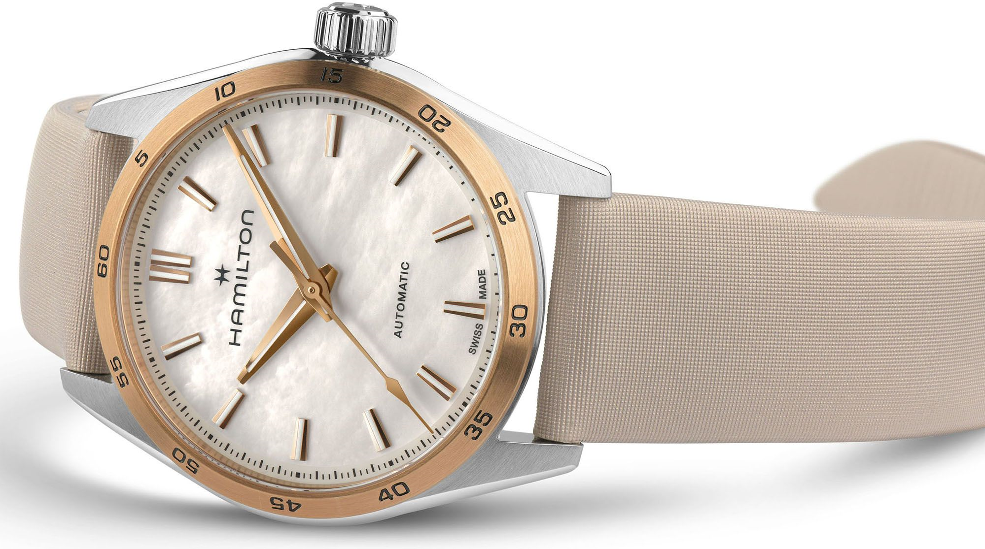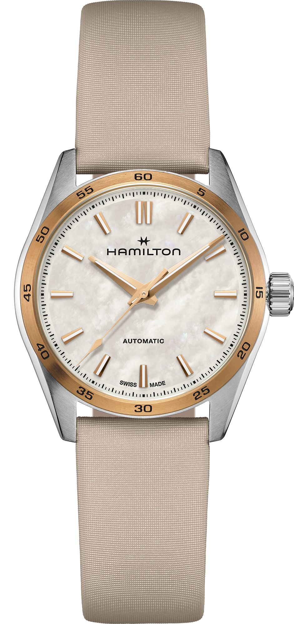 Řada Jazzmaster Performer, vytvořená pro ty, kteří upřednostňují funkci a styl zároveň, nabízí silný sportovně elegantní vzhled. Tento Jazzmaster Performer Automatic je poháněn automatickým strojkem H-10 s rezervou chodu 80 hodin a má 34mm pouzdro z nerezové oceli s růžovým zlatem potaženým rámečkem potaženým PVD, zvýrazněným duhovým perleťovým ciferníkem a béžovým saténovým páskem.