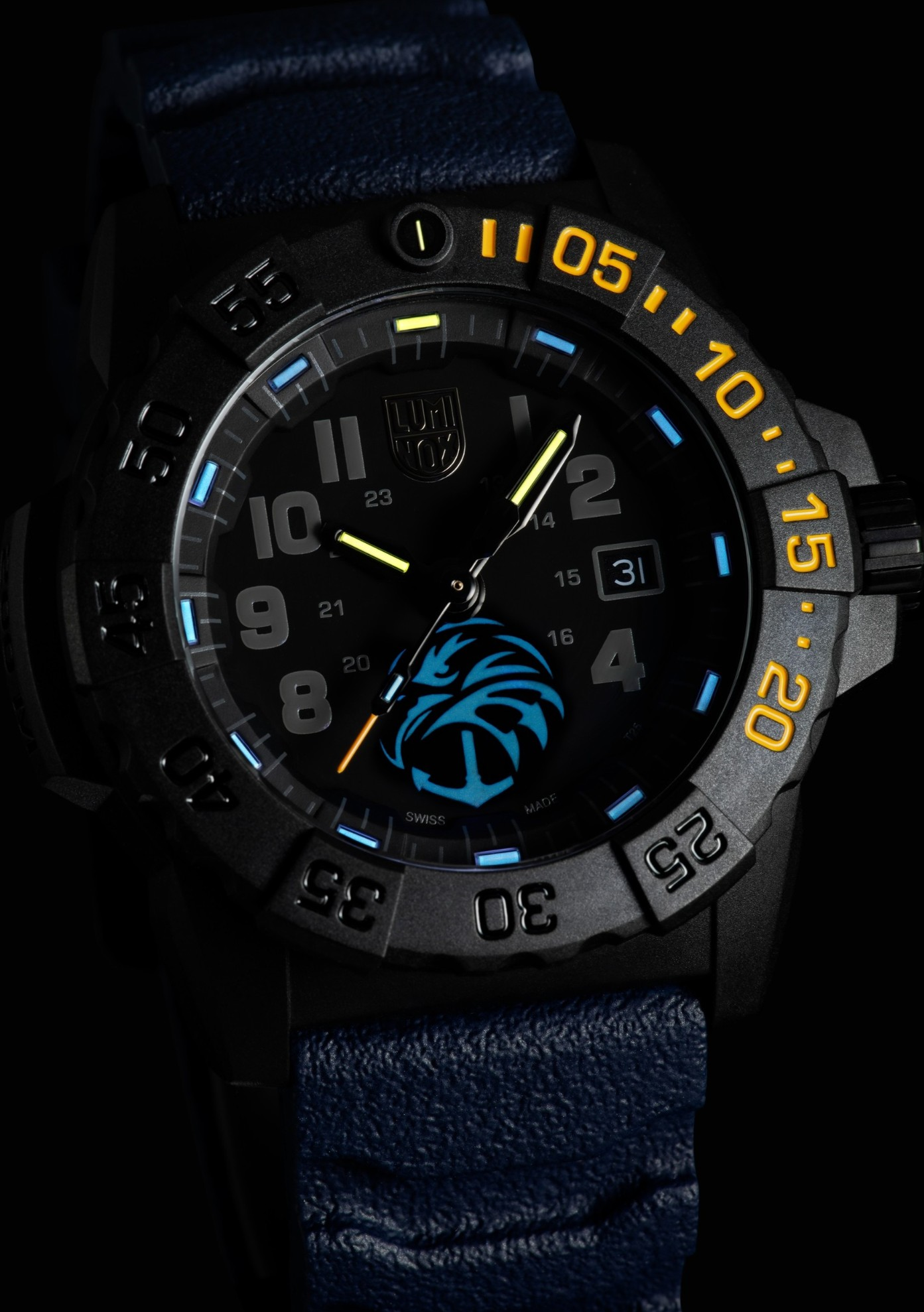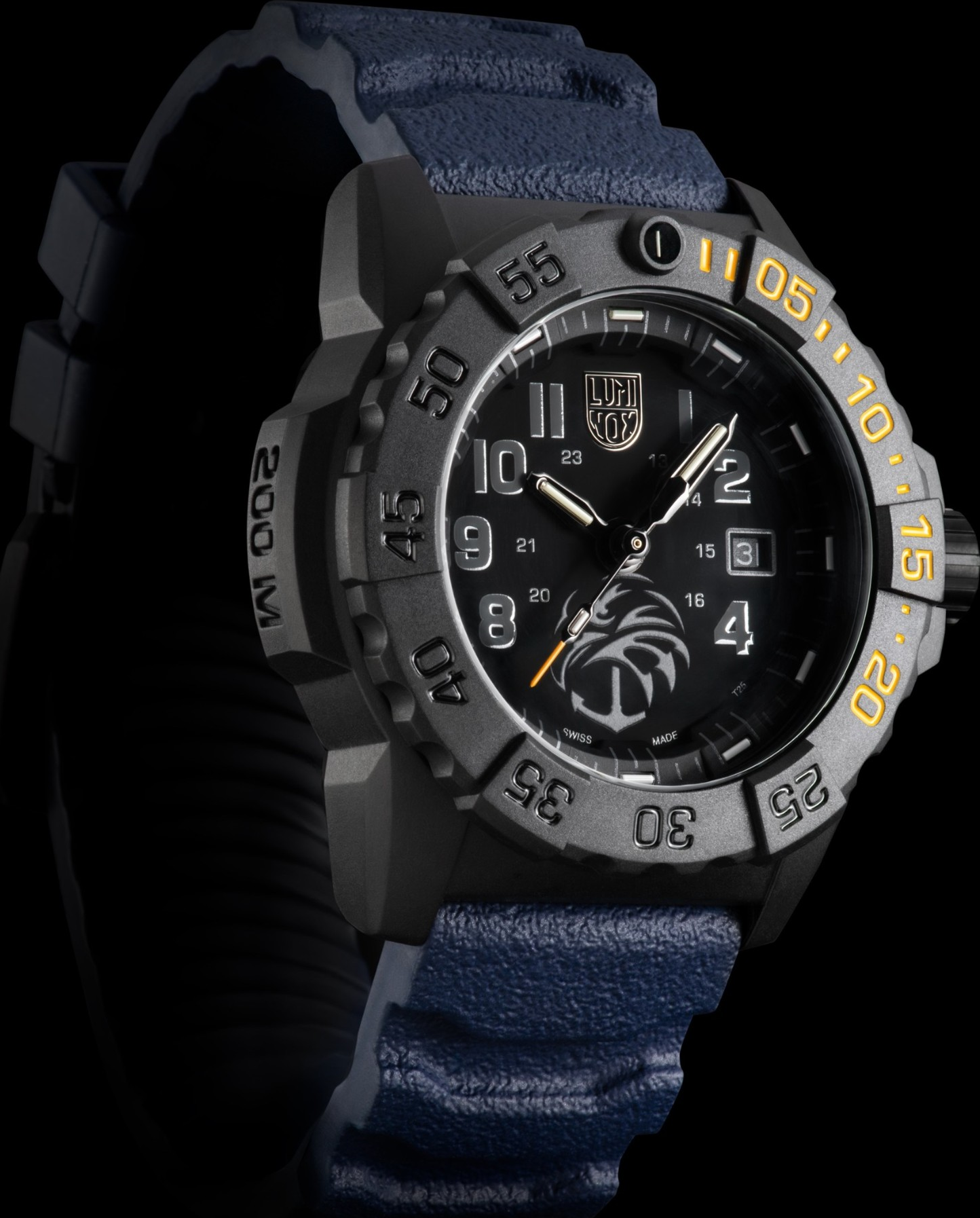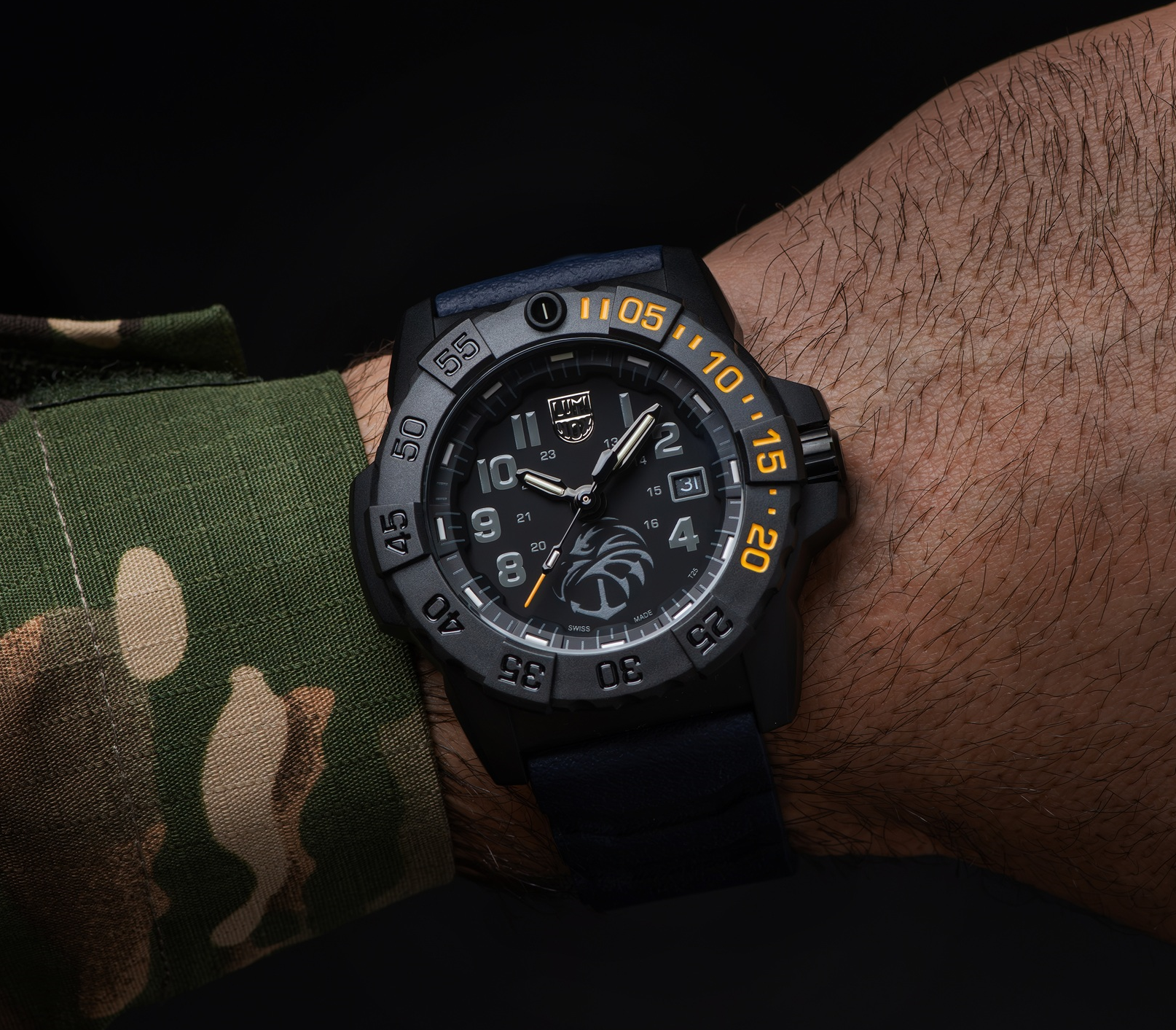 Číselník této reference je navržen s důrazem na symboliku i funkčnost. Výrobce přímo uvádí, že na pozici 6. hodiny se nachází logo Navy SEAL Foundation pokryté Super-LumiNova®, které ve tmě jasně svítí jako symbol vedení, ochrany a naděje. Právě tento detail je pro model zásadní a jasně jej odlišuje od běžných Navy SEAL variant. Hodinky zobrazují čas a datum a doplňuje je jednosměrně otočná luneta, která podporuje military dive charakter modelu. O noční čitelnost se dále stará Luminox Light Technology, díky níž jsou hodinky viditelné až po dobu 25 let. Přední stranu chrání tvrzené minerální sklíčko. Čelní strana XS.3505.NSF.N tak působí velmi technicky, ale současně má silnější emocionální přesah než běžné vojenské modely. Logo na 6. hodině nepůsobí jako marketingový prvek navíc. Naopak - je smysluplně zakomponované do celku a současně zachovává velmi dobrou čitelnost. To je u podobně pojaté limitky mimořádně důležité a zde je to zvládnuto velmi přesvědčivě.