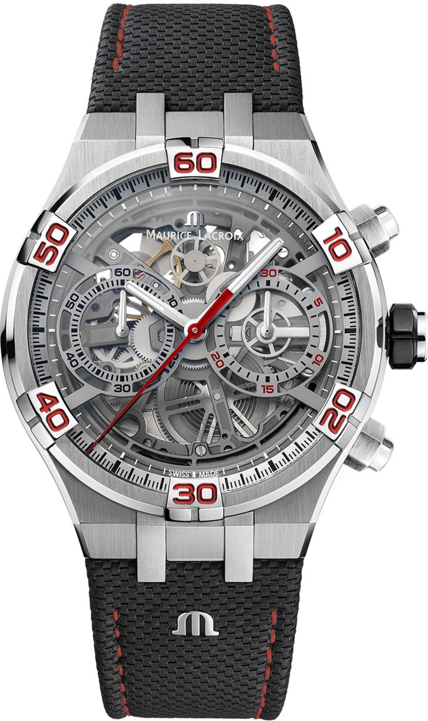 Funkce:Čas, chronograf = stopky, manufakturní strojek Swiss Maurice Lacroix ML206 - rezerva chodu 48 hodin, 25 kamenů, 28.800 polokmitů setrvačky za hodinu = přesnost chodu 2 - 4 vteřiny denně, automatický nátah (hodinky se natahují pohybem ruky) + ruční nátah (hodinky lze natáhnout/dotáhnout dle potřeby i ručně korunkou), rotor samonátahu disponuje funkcí oboustranného nátahu, ručičky a indexy jsou opatřeny tenkou vrstvou luminiscence (luminiscenční vrstva po nasvícení dlouhou dobu svítí, což je praktické za šera a v noci), šroubovací vodotěsná korunka. Dekorace skeletonového strojku: ruthenium pískovaný skeletový horní můstek, vertikální Côtes de Genève a paprskovitě kartáčovaný na můstek rotoru a rotor + leštěné úhly, rodiované ručičky.