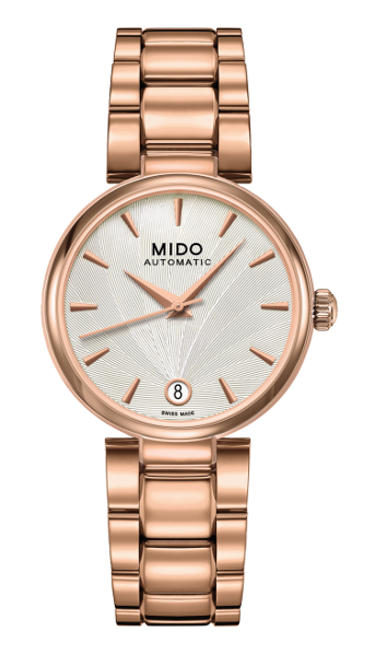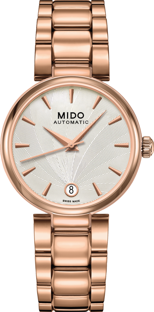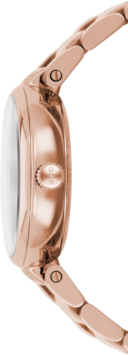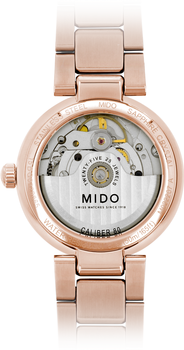 Funkce:Čas, datum, strojek swiss Mido caliber 80.611 - vyráběn firmou Eta exklusivně pro Mido = 25 kamenů (krokové ústrojí ocel/kámen), rezerva chodu 80 hodin, polokmity setrvačky 21.600/h = přesnost chodu 3 - 5 vteřin denně (nižší polokmity setrvačky jsou vyladěny jemnou regulací na věnci setrvačky pro maximální přesnost strojku), ozdobně lapovaný rotor, automatický nátah (pohyb ruky) + ruční nátah (hodinky lze také natahovat i korunkou), průhledné zadní víčko pro náhled na strojek, zapínání náramku - překlapávací spona (pevné praktické zapínání), ozdobně lapovaný rotor samonátahu, nárazuvzdorné