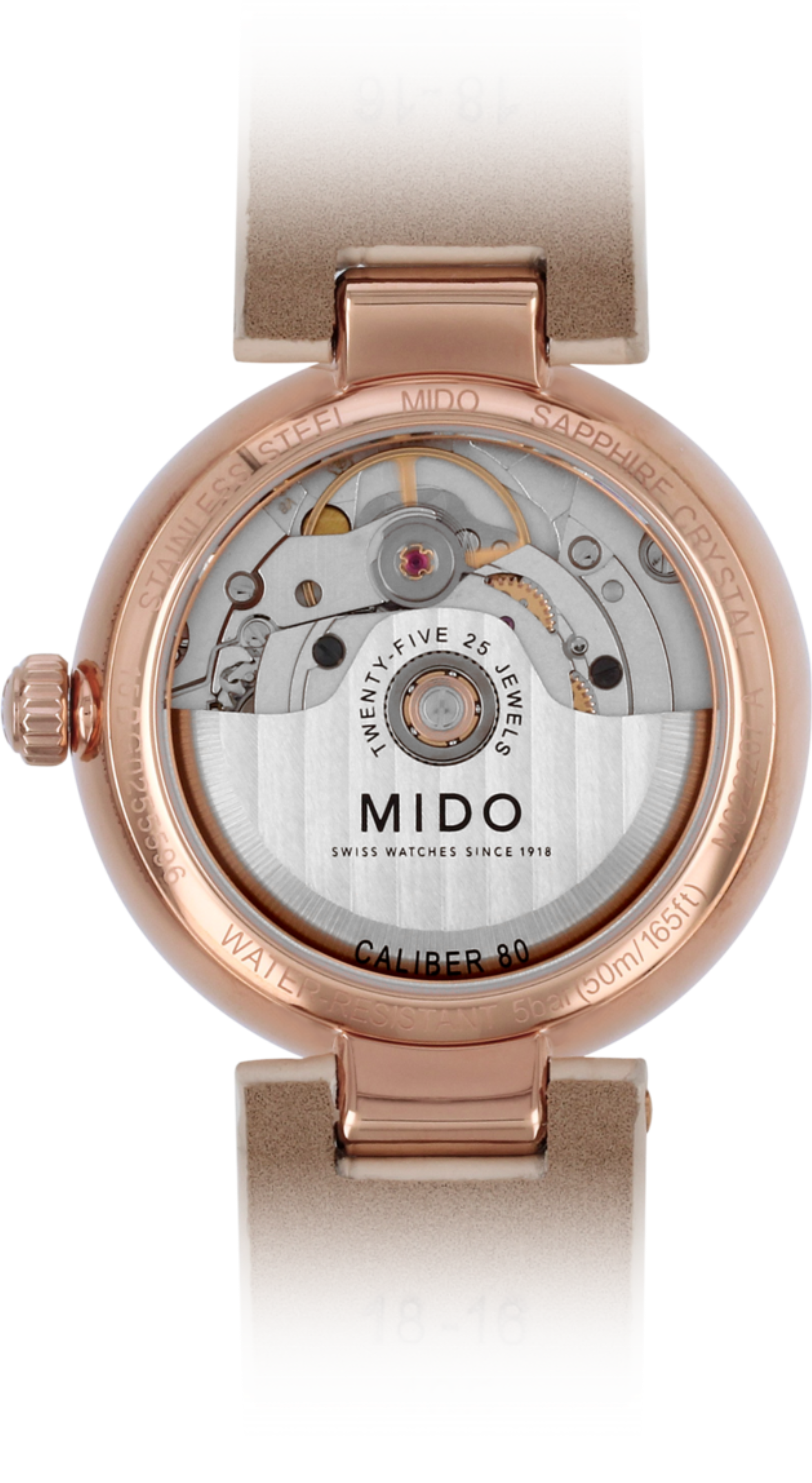 Funkce:Čas, datum, strojek swiss Mido caliber 80.611 - vyráběn firmou Eta exklusivně pro Mido = 25 kamenů (krokové ústrojí ocel/kámen), rezerva chodu 80 hodin, polokmity setrvačky 21.600/h = přesnost chodu 3 - 5 vteřin denně (nižší polokmity setrvačky jsou vyladěny jemnou regulací na věnci setrvačky pro maximální přesnost strojku), ozdobně lapovaný rotor, automatický nátah (pohyb ruky) + ruční nátah (hodinky lze také natahovat i korunkou), průhledné zadní víčko pro náhled na strojek, zapínání náramku - překlapávací spona (pevné praktické zapínání), ozdobně lapovaný rotor samonátahu, číselník zdobí 8 diamantů o váze 0,040 karátů