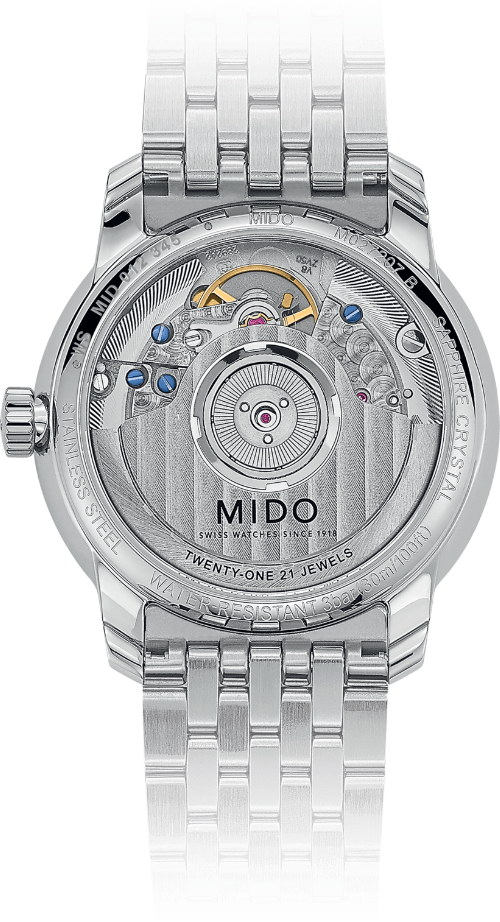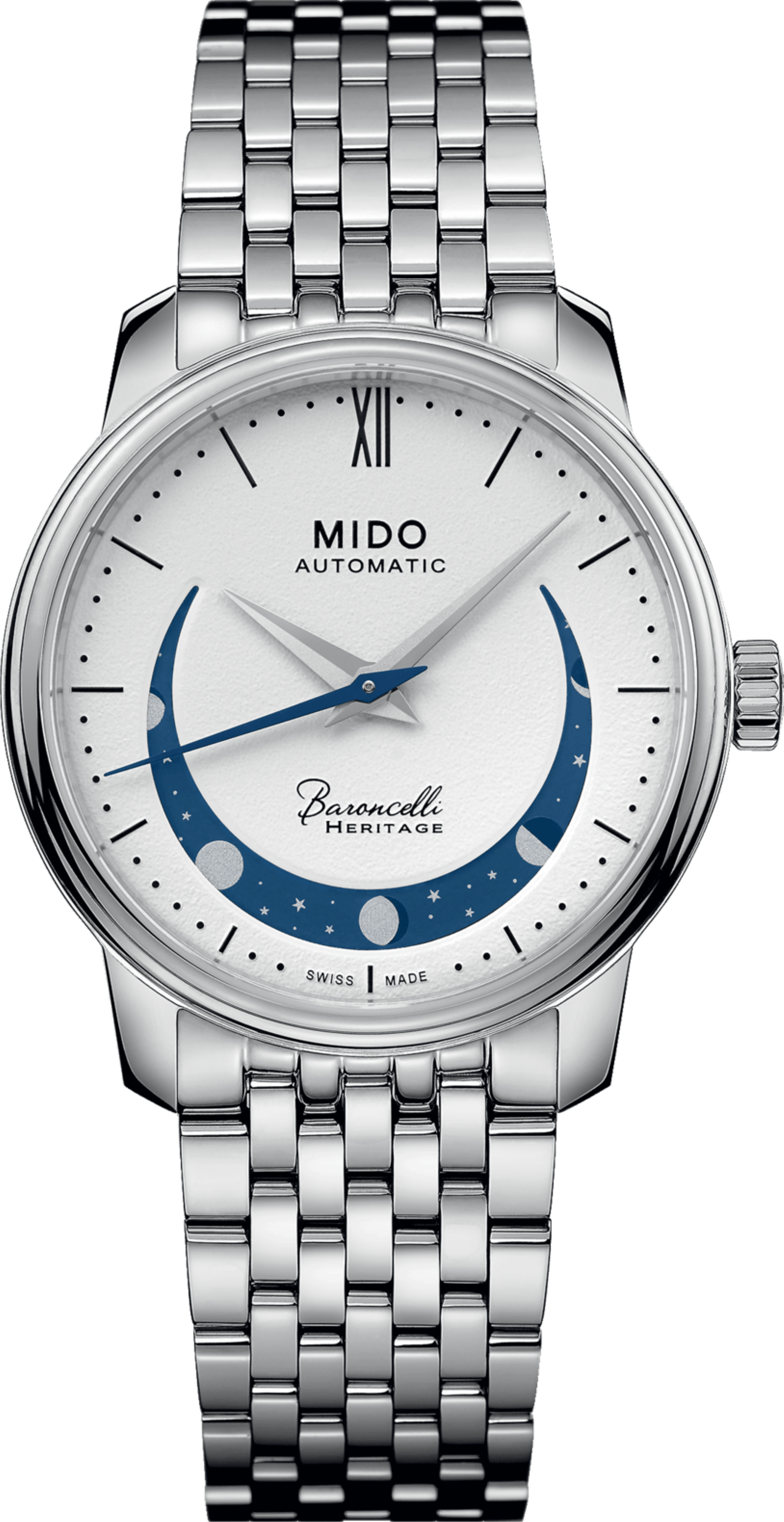 Funkce:Čas, měsíční fáze, strojek swiss Mido 1192 (ETA 2892-A2) - 21 kamenů, rezerva chodu 50 hodin, polokmity setrvačky 28.800/h = přesnost chodu 2 - 4 vteřiny denně, automatický (pohyb ruky) + ruční nátah (hodinky lze také natahovat i korunkou), krokové ústrojí ocel/kámen, průhledné zadní víčko pro náhled na strojek, ozdobně lapovaný rotor samonátahu