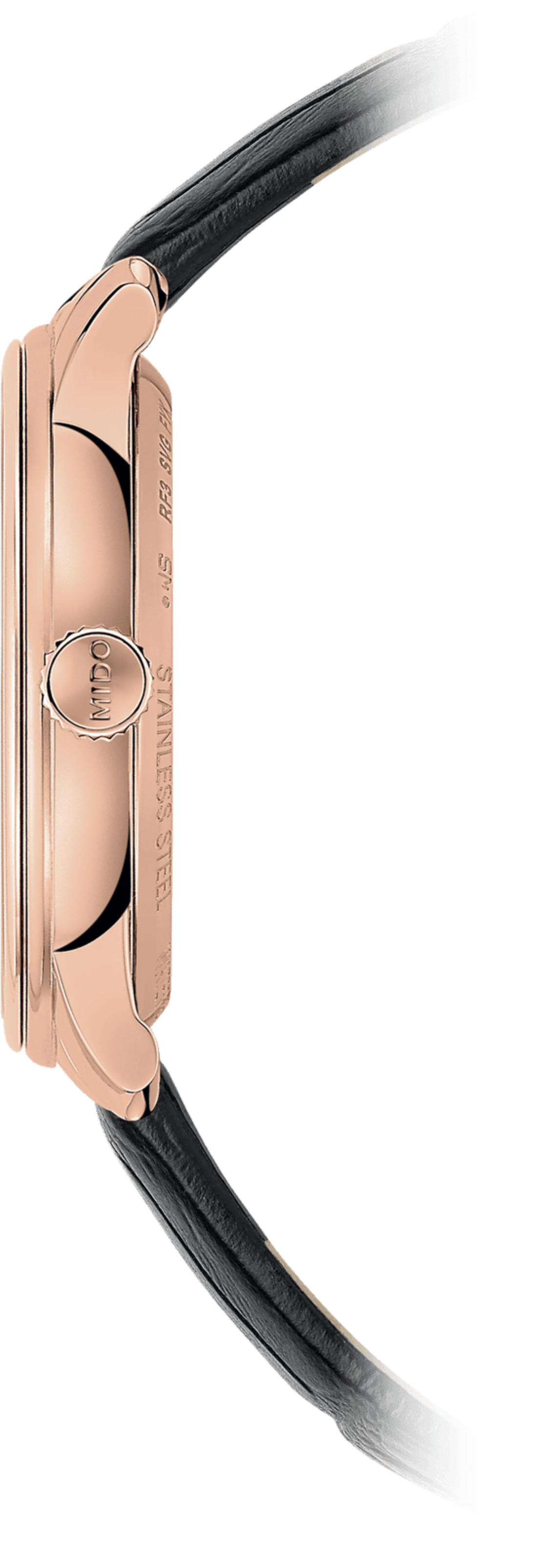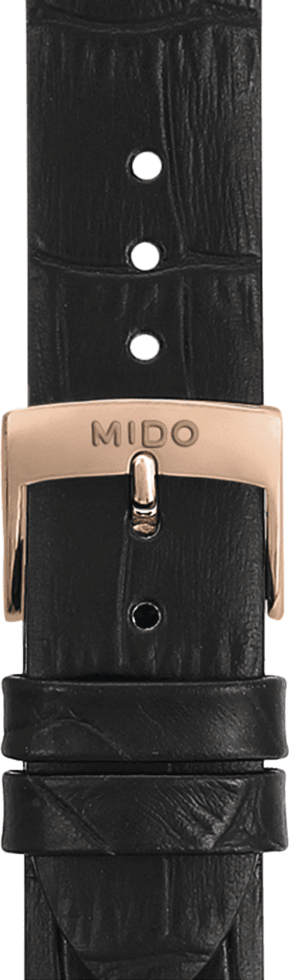 Průhledná zadní část pouzdra umožňuje obdivovat krásu jemně zdobeného strojku na úrovni Elaboré. Tento strojek švýcarské výroby Mido Automatic Eta 2671 disponuje s rezervou chodu 44 hodin. V praxi to znamená, že jsou-li hodinky plně nataženy a odložíme-li je např. v pátek odpoledne na stůl, ještě v neděli ráno ráno nám jdou a ukazují přesný čas. Rezerva chodu 44 hodin je komfortní a má pozitivní vliv i na stabilitu přesnosti chodu.