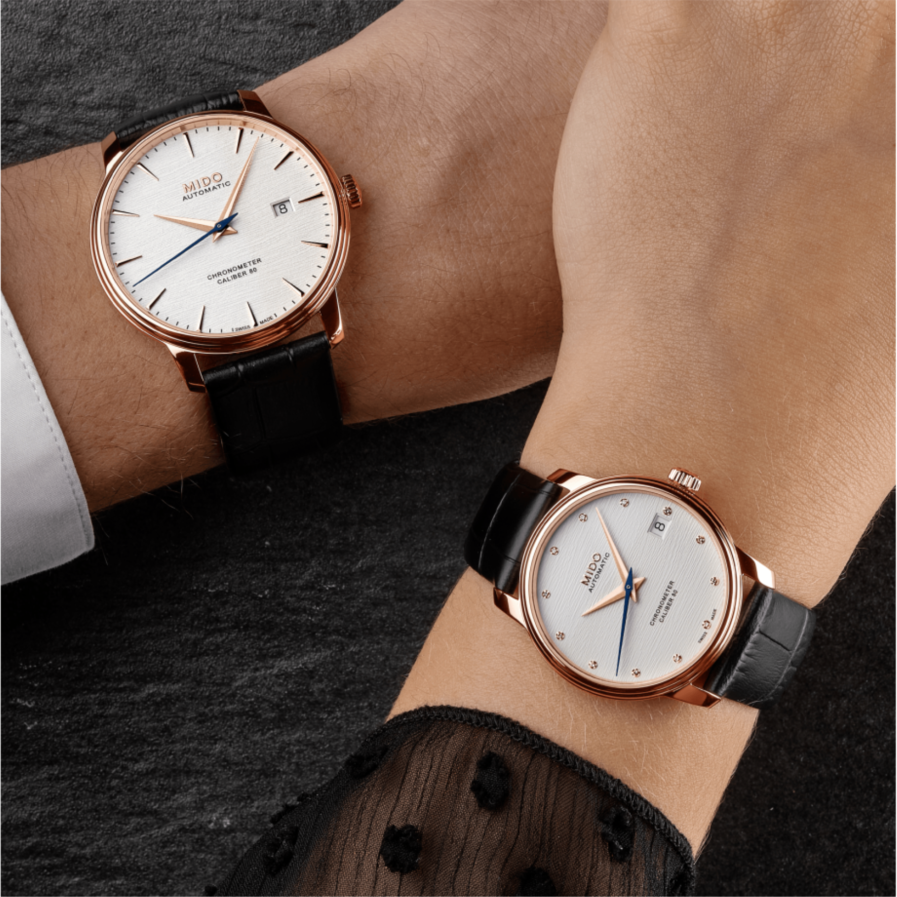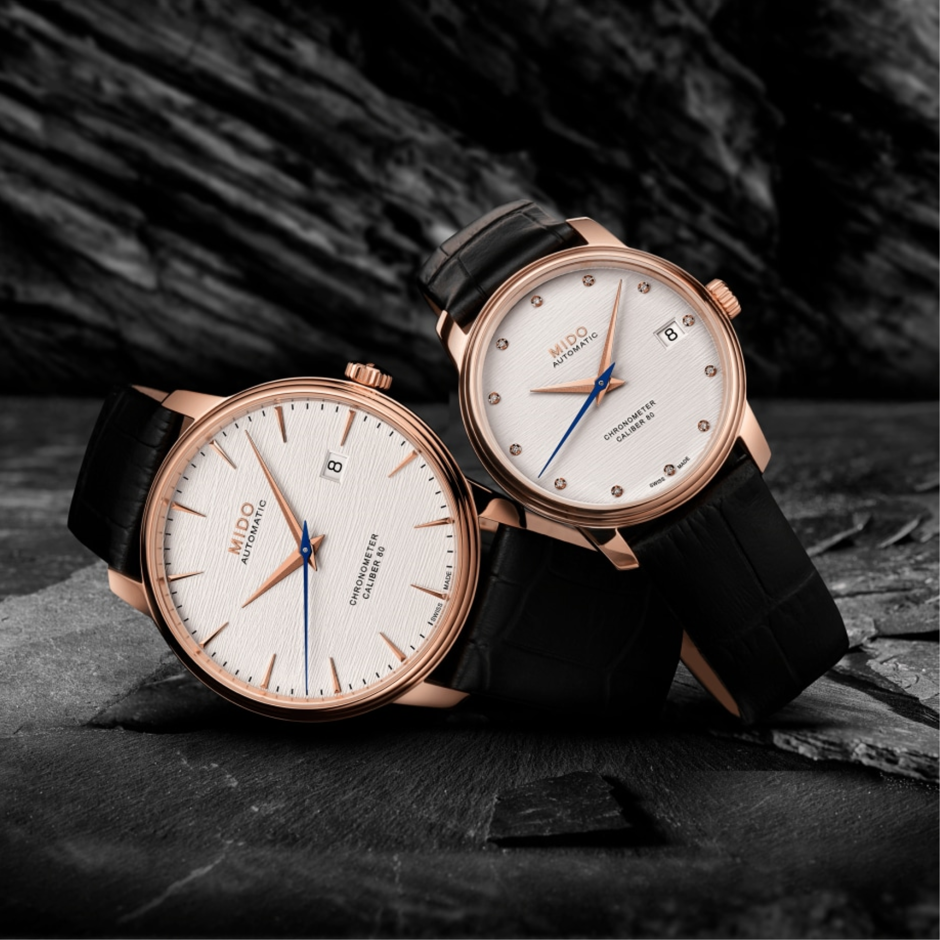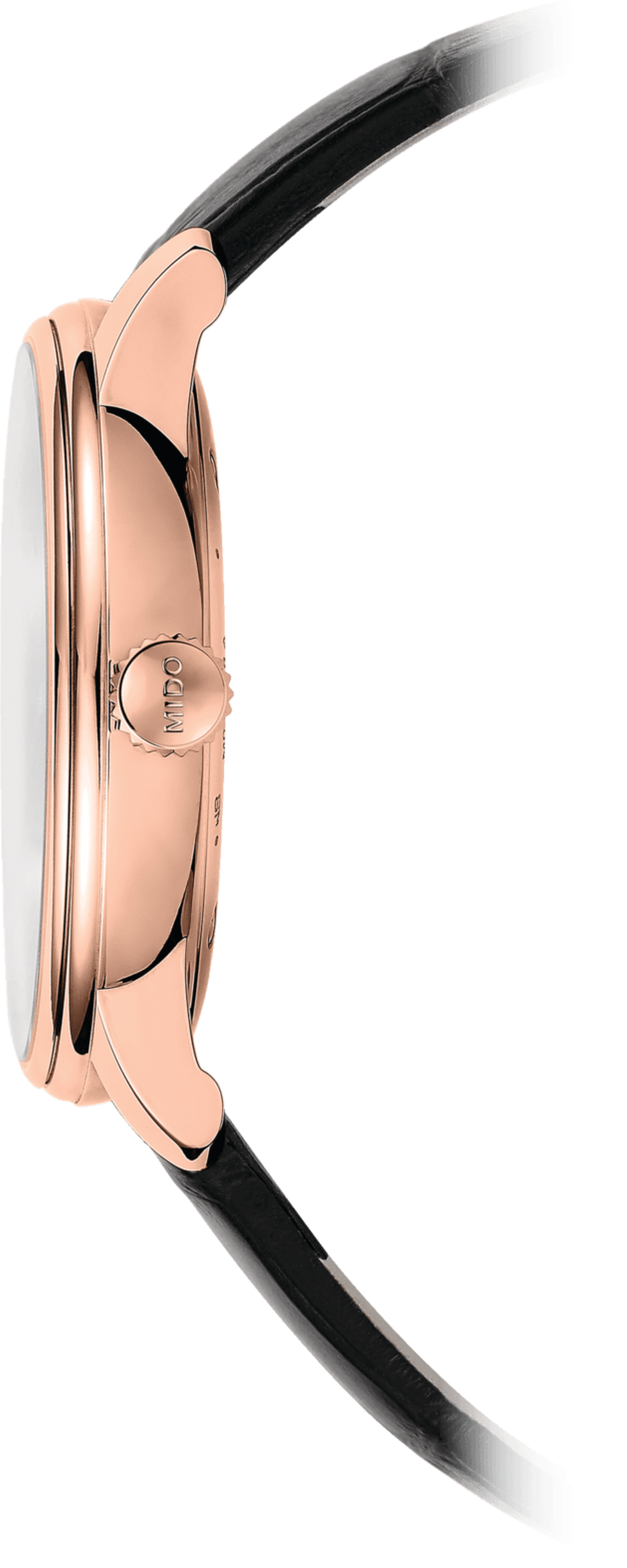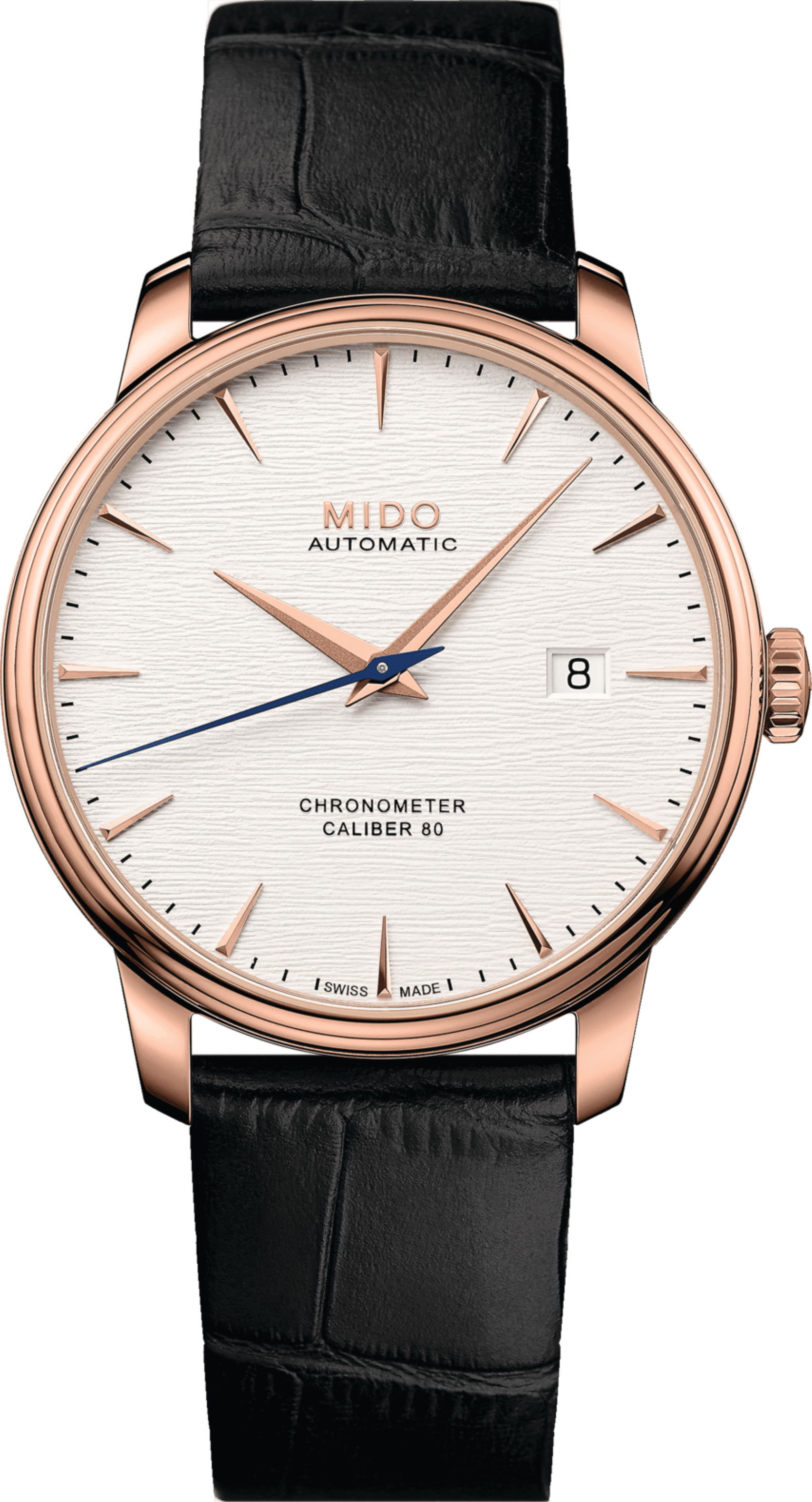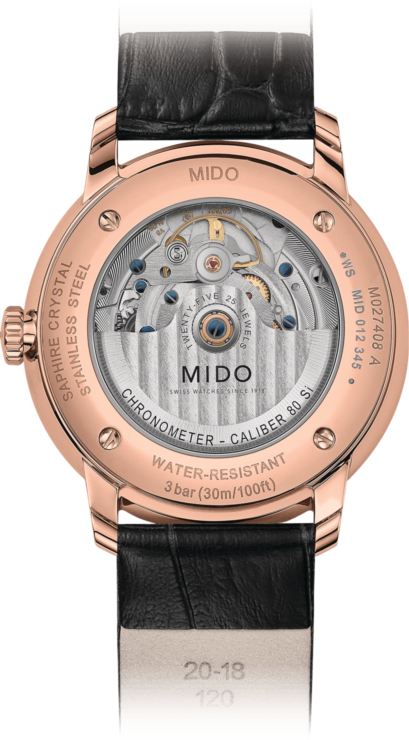 Funkce:Čas, datum, strojek Swiss Mido Caliber 80.821 COSC (základ ETA C07.821) - rezerva chodu 80 hodin, polokmity setrvačky 21.600/h (nižší polokmity jsou vyladěny na nejvyšší možnou přesnost strojku jemnou regulací na věnci setrvačky + další úpravy stroje na vyšší přesnost pro certifikaci COSC) = přesnost chodu 0 - 3 vteřiny denně, Si křemíkový vlásek - dlouhodobá přesnost strojku (lepší odolnost proti nárazům a lepší anti-magnetické vlastnosti), krokové ústrojí ocel/kámen, 25 kamenných uložení, průhledné zadní víčko pro náhled na strojek, automatický nátah (pohyb ruky) + ruční nátah (hodinky lze také natahovat i korunkou)
