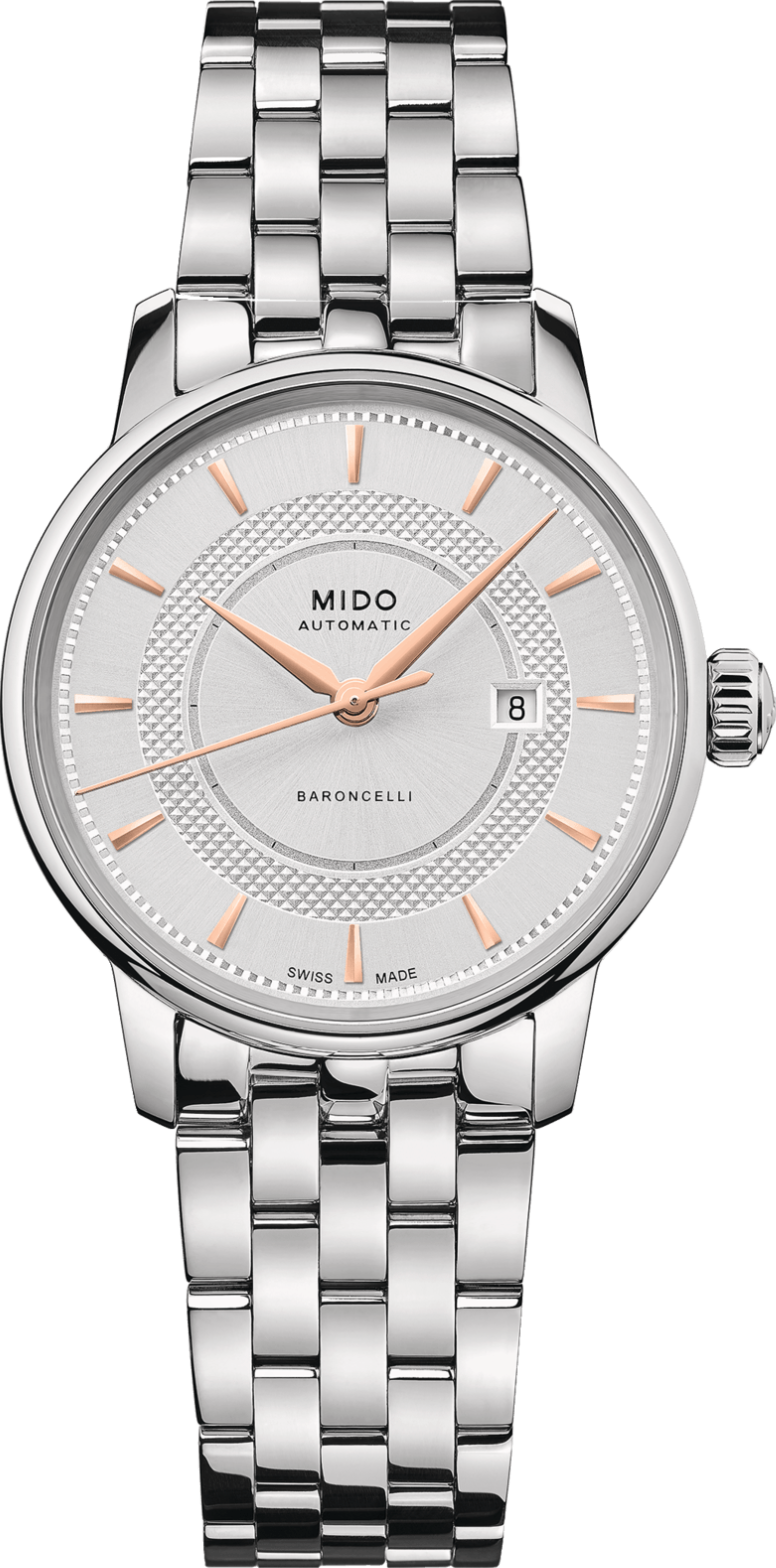 Funkce:Čas, datum, strojek Swiss Mido Automatic Eta 2671, 25 kamenových uložení, rezerva chodu 44 hodin, krokové ústrojí ocel/kámen, polokmity setrvačky 28.800 (4 Hz) = přesnost chodu (diference) 2 - 4 vteřiny denně, vlásek setrvačky je vyroben z materiálu Nivachron (velmi dobře odolává magnetickému poli a díky tomu jsou hodinky přesnější a stabilnější v chodu), automatický nátah (hodinky se natahují pohybem ruky) + ruční nátah (hodinky lze natáhnout/dotáhnout dle potřeby i ručně korunkou, rotor samonátahu disponuje funkcí oboustranného nátahu