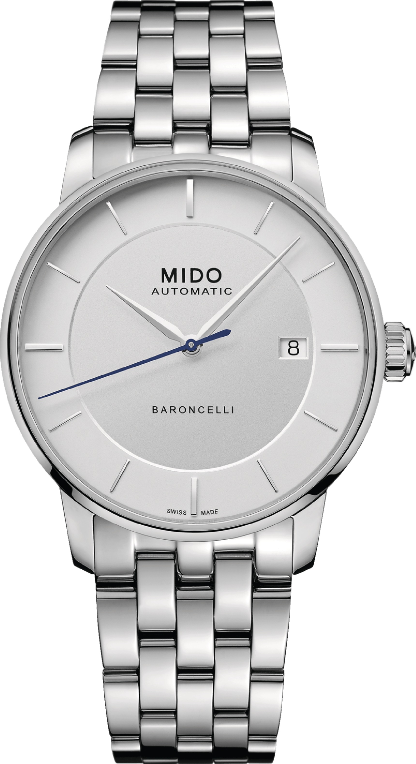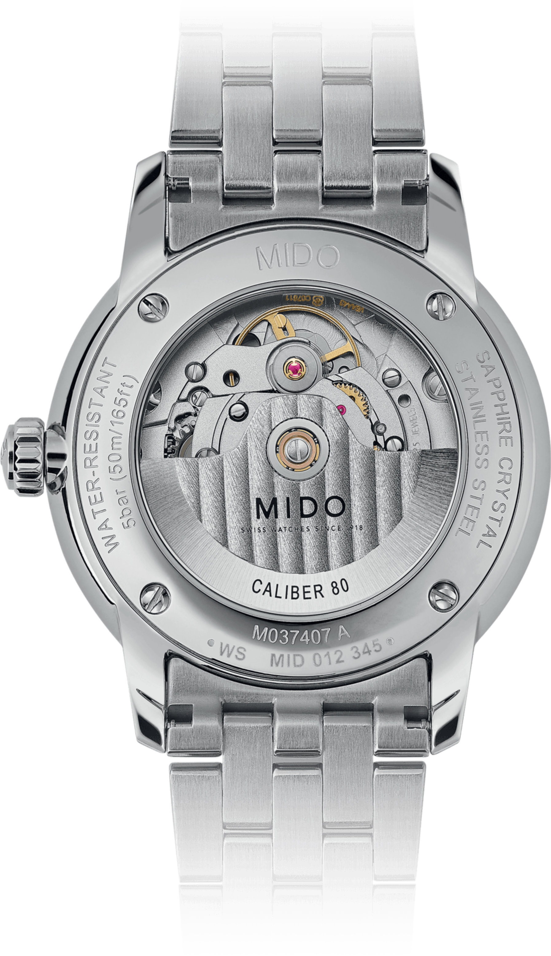 Funkce:Čas, datum, strojek swiss Mido caliber 80 (základ ETA C07.611) - vyráběn firmou Eta exklusivně pro Mido = 25 kamenů (krokové ústrojí ocel/kámen), vlásek setrvačky je vyroben z materiálu Nivachron® (velmi dobře odolává magnetickému poli a případným otřesům hodinek - díky tomu jsou hodinky přesnější a stabilnější v chodu), rezerva chodu 80 hodin, polokmity setrvačky 21.600/h = přesnost chodu 3 - 5 vteřin denně (nižší polokmity setrvačky jsou vyladěny jemnou regulací na věnci setrvačky pro maximální přesnost strojku), ozdobně lapovaný rotor samonátahu, automatický nátah (pohyb ruky) + ruční nátah (hodinky lze také natahovat i korunkou), průhledné zadní víčko pro náhled na strojek