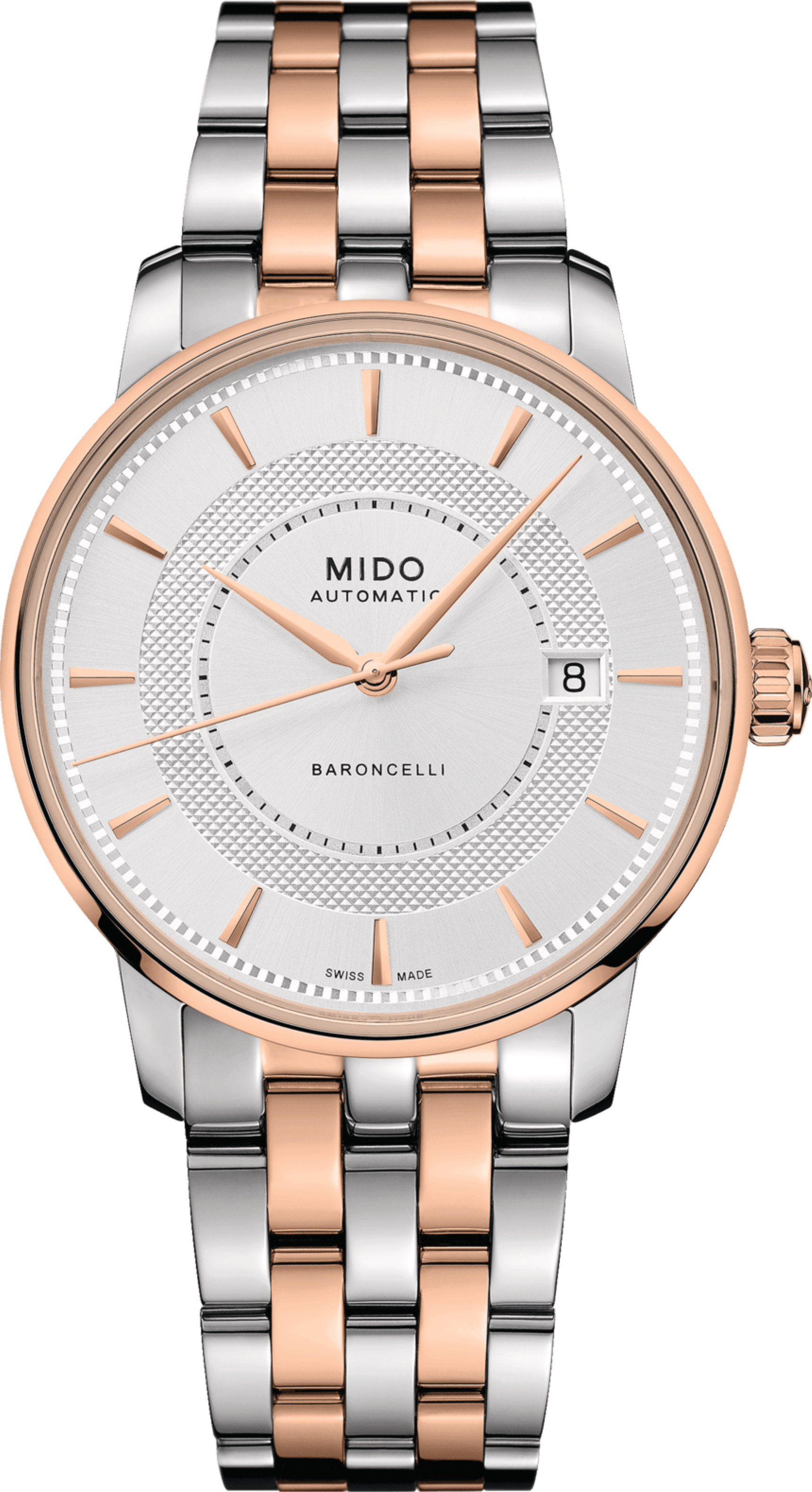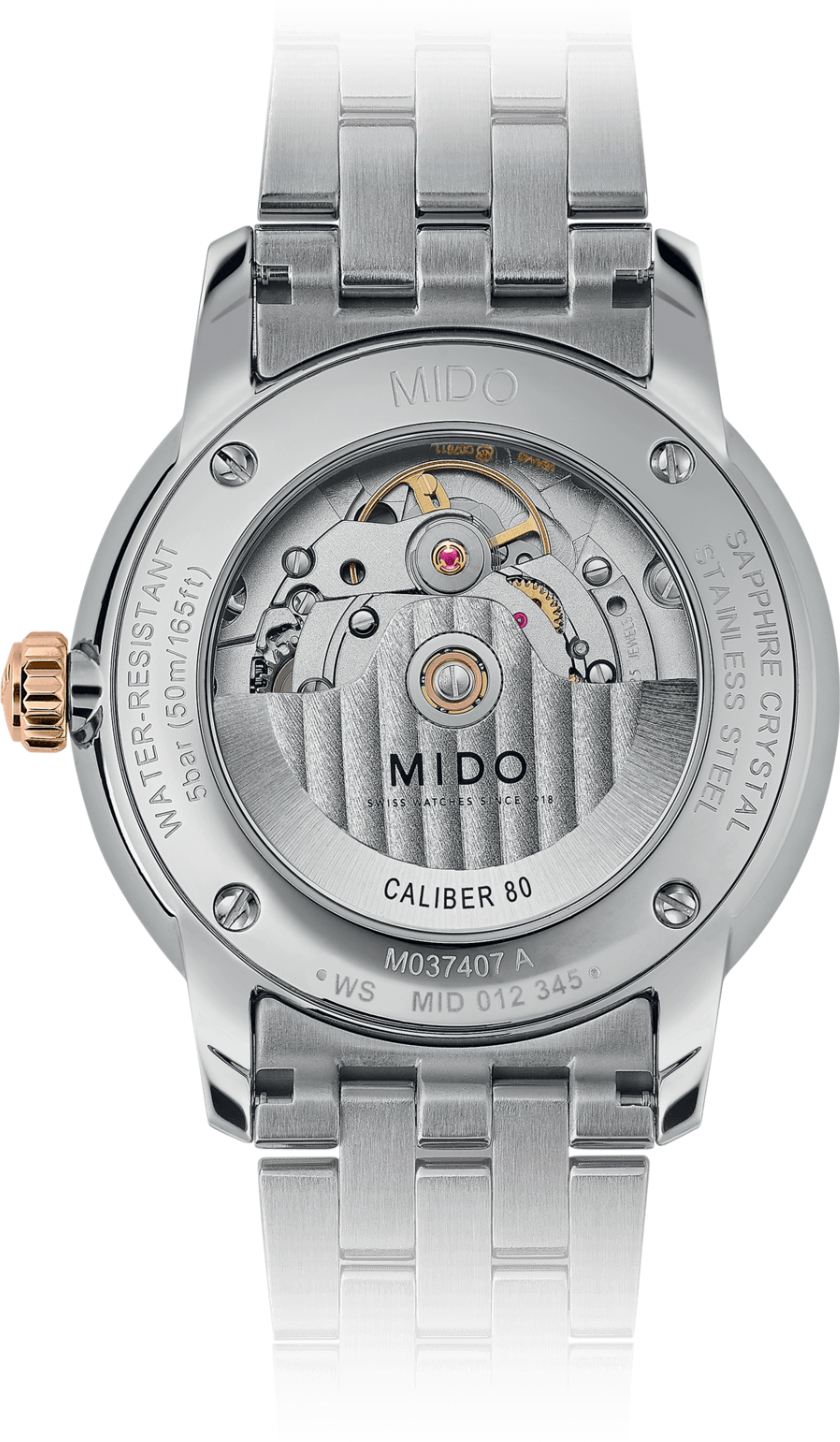 Funkce:Čas, datum, strojek swiss Mido caliber 80 (základ ETA C07.611) - vyráběn firmou Eta exklusivně pro Mido = 25 kamenů (krokové ústrojí ocel/kámen), vlásek setrvačky je vyroben z materiálu Nivachron® (velmi dobře odolává magnetickému poli a případným otřesům hodinek - díky tomu jsou hodinky přesnější a stabilnější v chodu), rezerva chodu 80 hodin, polokmity setrvačky 21.600/h = přesnost chodu 3 - 5 vteřin denně (nižší polokmity setrvačky jsou vyladěny jemnou regulací na věnci setrvačky pro maximální přesnost strojku), ozdobně lapovaný rotor samonátahu, automatický nátah (pohyb ruky) + ruční nátah (hodinky lze také natahovat i korunkou), průhledné zadní víčko pro náhled na strojek
