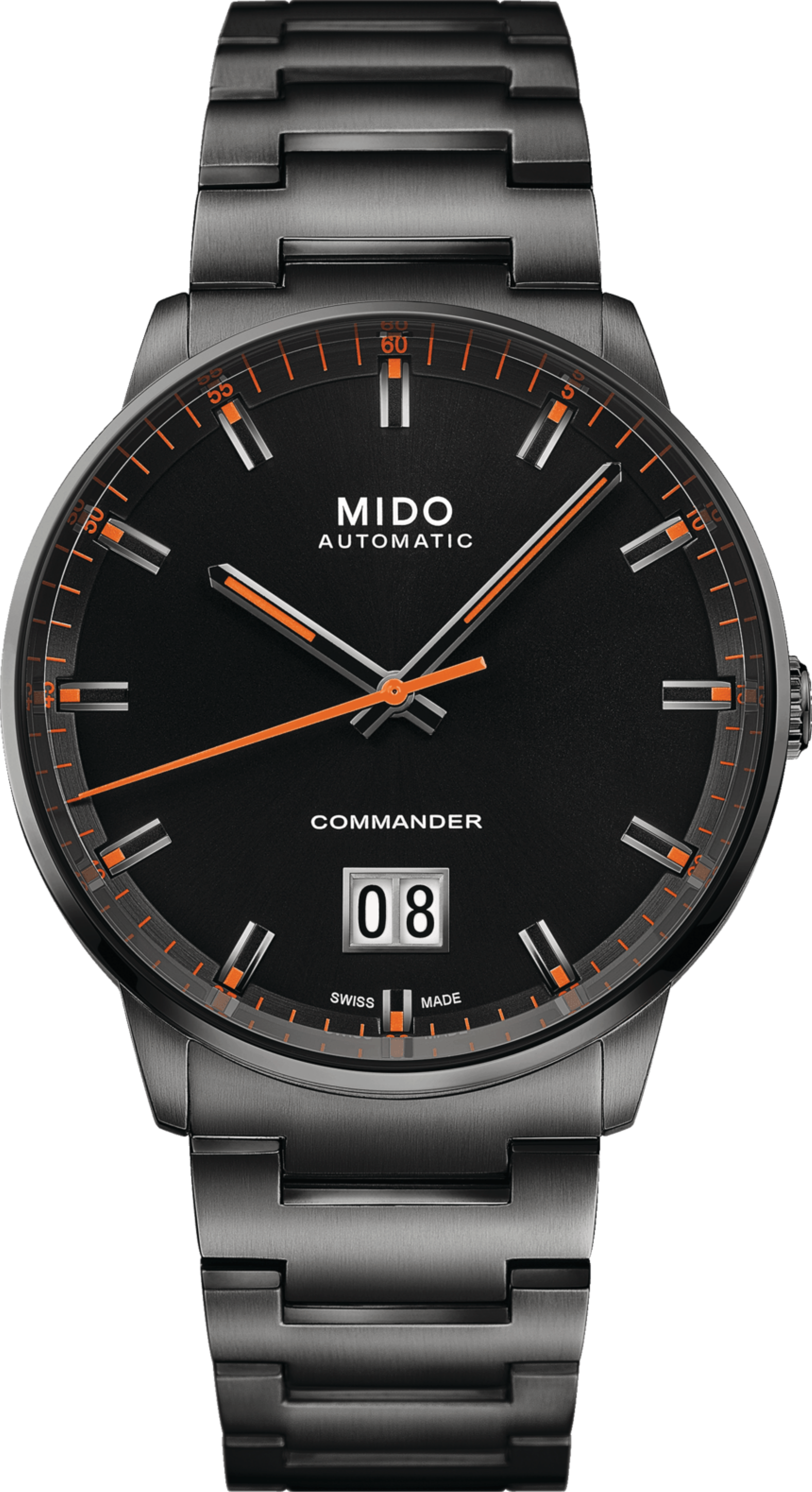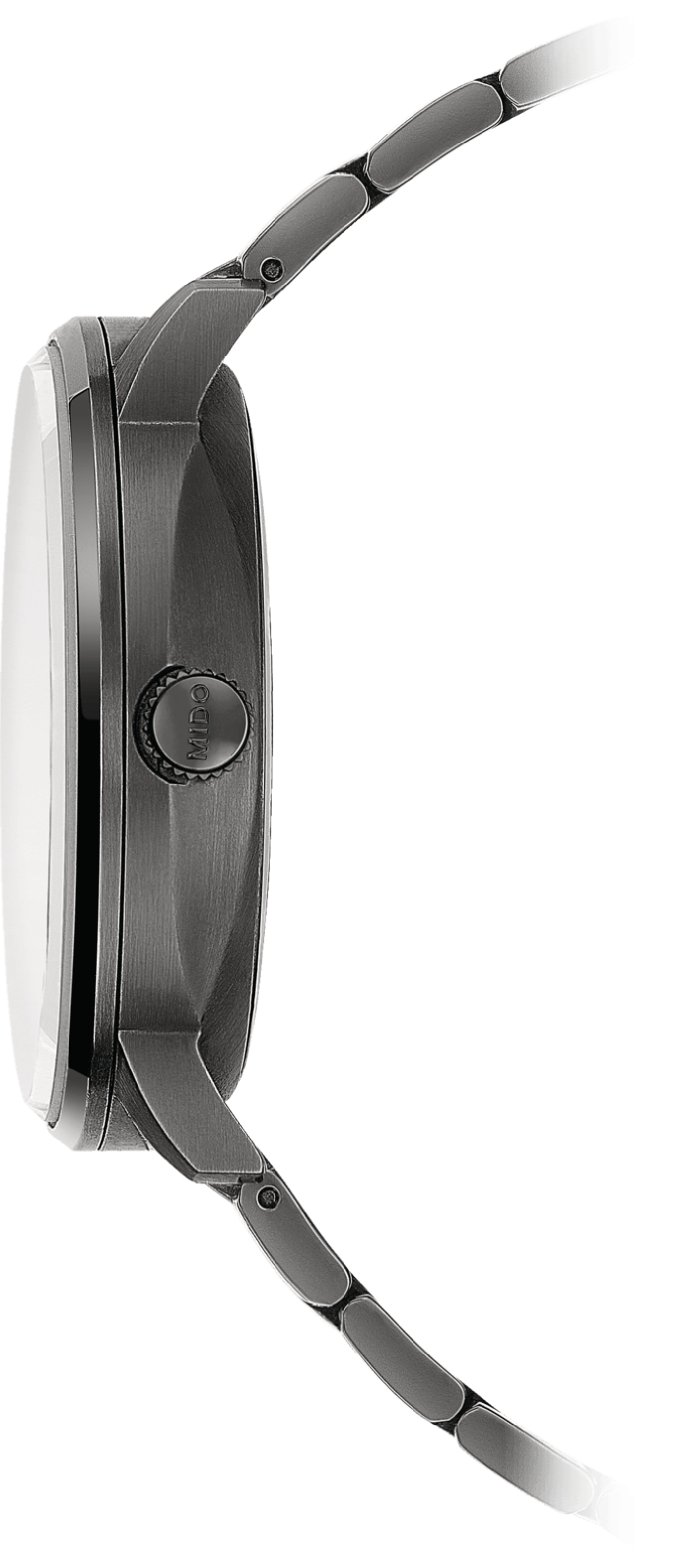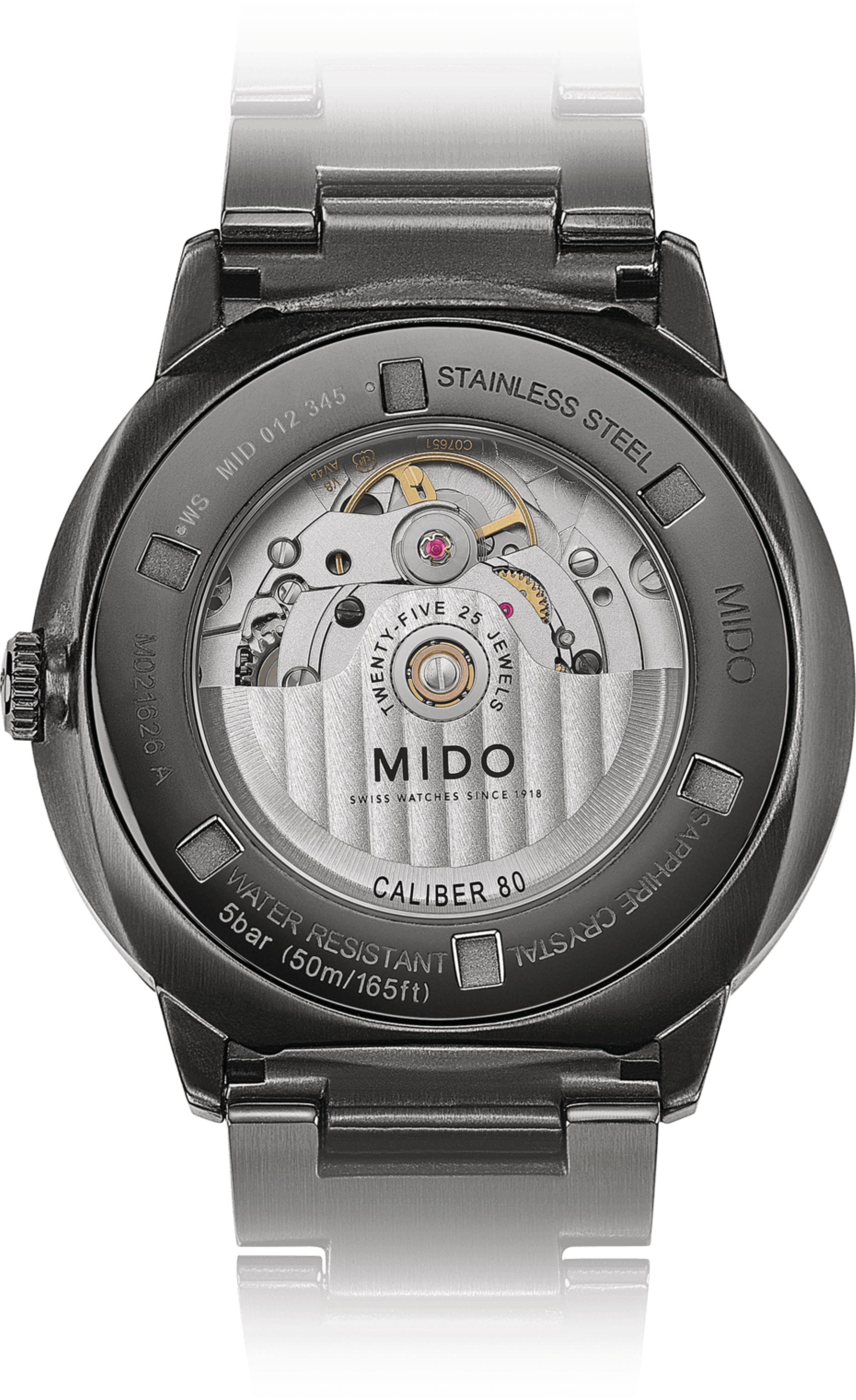 Funkce:Čas, datum, strojek swiss Mido caliber 80 (základ ETA C07.651) - vyráběn firmou Eta exklusivně pro Mido = 25 kamenů (krokové ústrojí ocel/kámen), rezerva chodu 80 hodin, polokmity setrvačky 21.600/h = přesnost chodu 3 - 5 vteřin denně (nižší polokmity setrvačky jsou vyladěny jemnou regulací na věnci setrvačky pro maximální přesnost strojku), ozdobně lapovaný rotor samonátahu, automatický nátah (pohyb ruky) + ruční nátah (hodinky lze také natahovat i korunkou), průhledné zadní víčko pro náhled na strojek, zapínání náramku - překlapávací spona (pevné praktické zapínání)