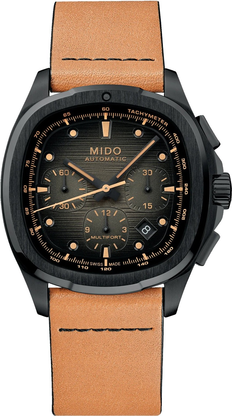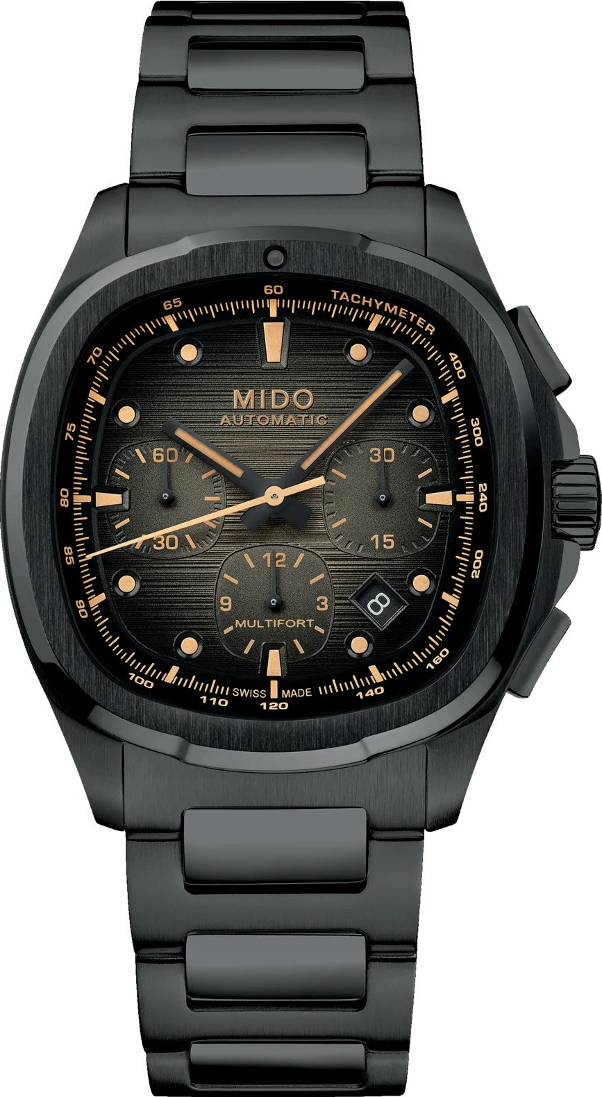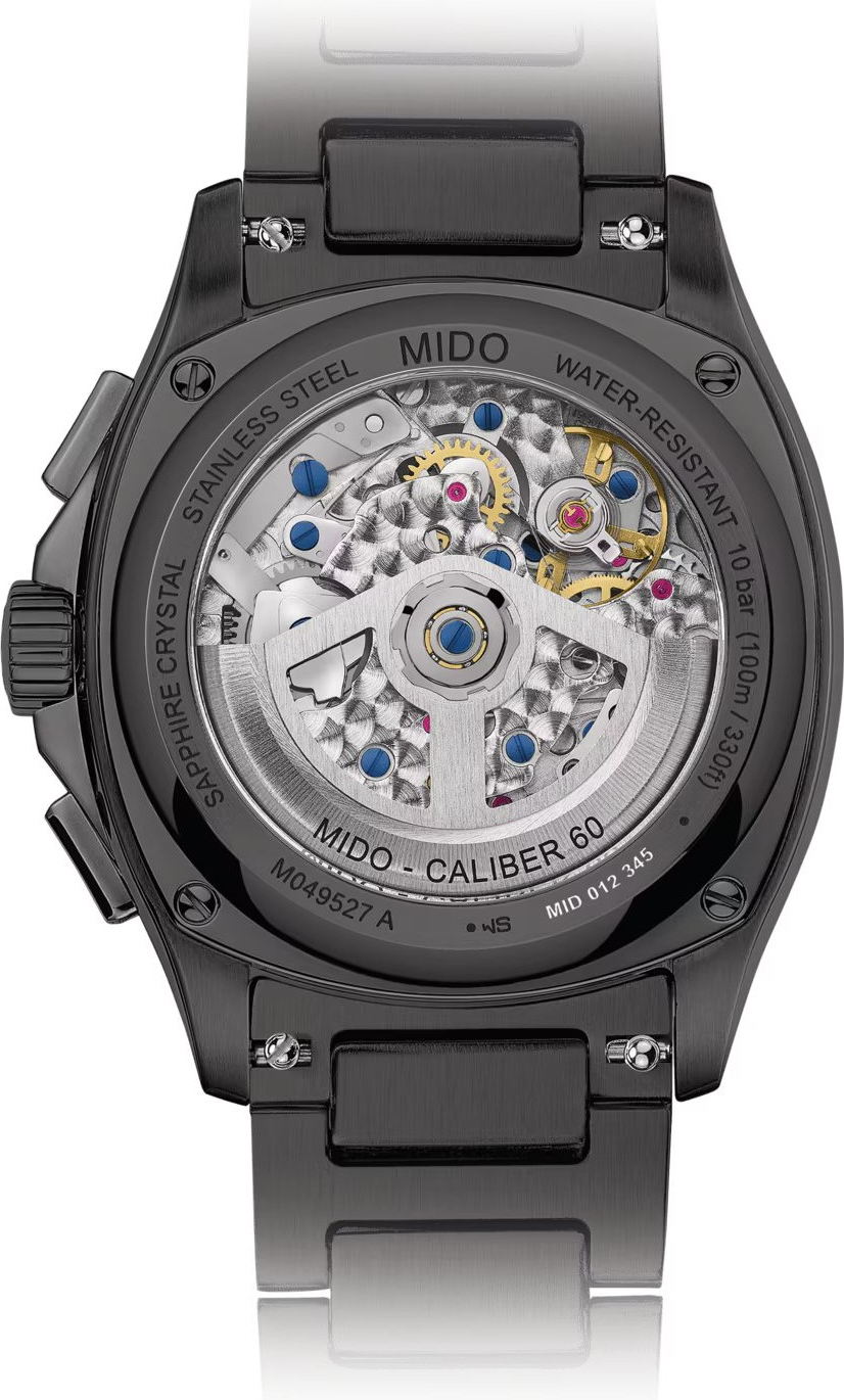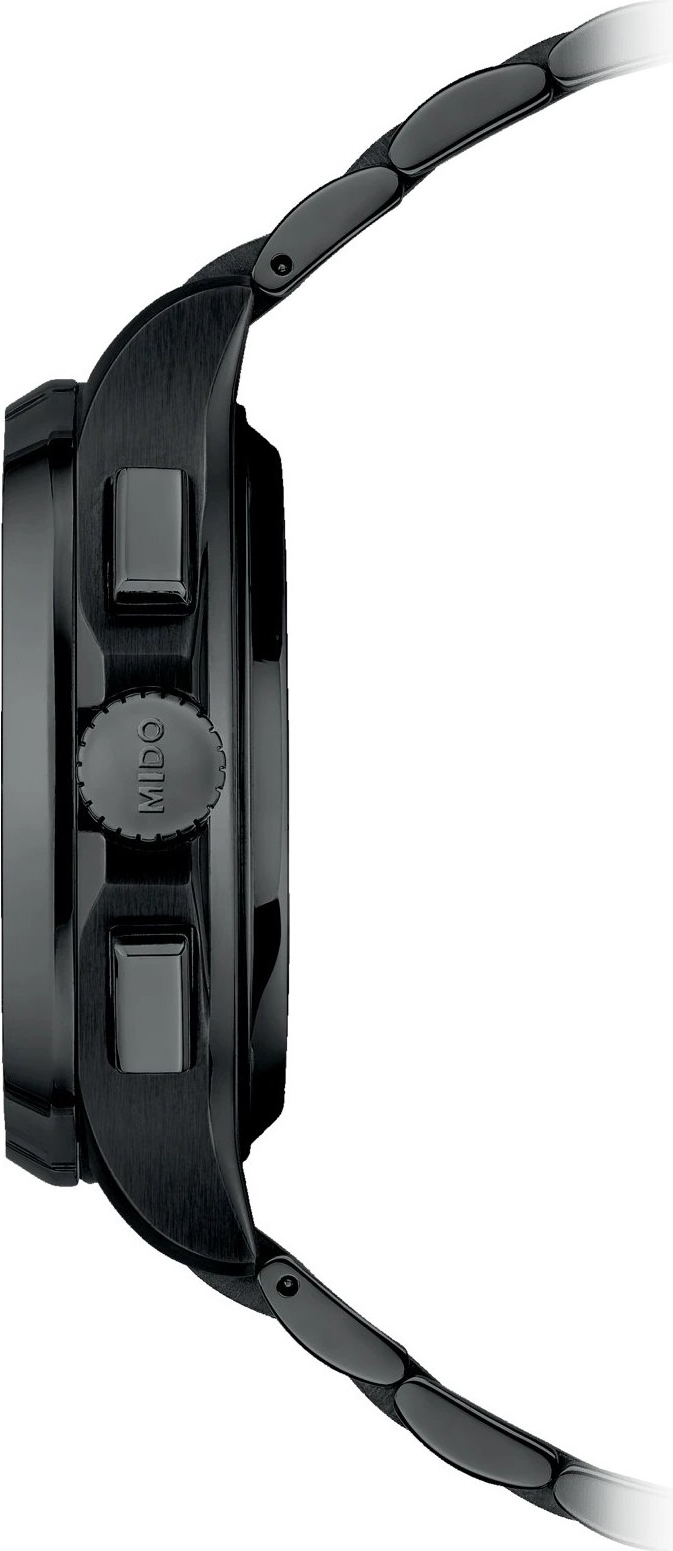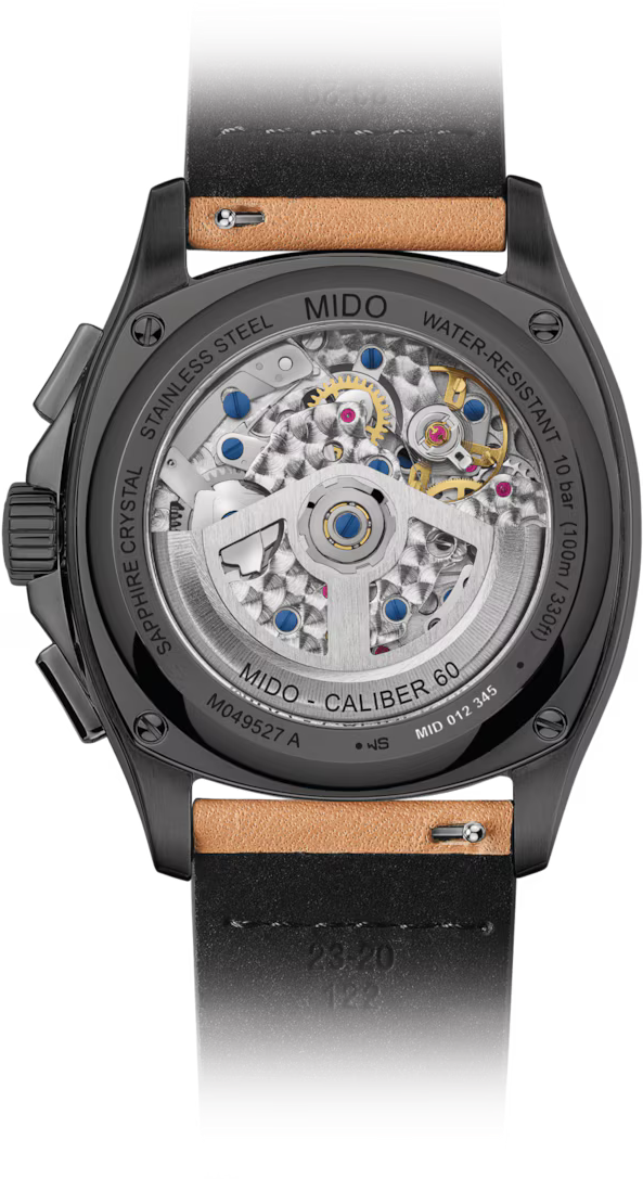 Funkce:Čas, datum, chronograf-stopky, strojek swiss Mido Caliber 60 = 27 kamenů (krokové ústrojí ocel/kámen), rezerva chodu 60 hodin, polokmity setrvačky 28.800/h = přesnost chodu 2 - 4 vteřin denně (nižší polokmity setrvačky jsou vyladěny jemnou regulací na věnci setrvačky pro maximální přesnost strojku), krokové ústrojí ocel/kámen, ozdobně lapovaný rotor samonátahu, automatický nátah (pohyb ruky) + ruční nátah (hodinky lze také natahovat i korunkou), průhledné zadní víčko pro náhled na strojek