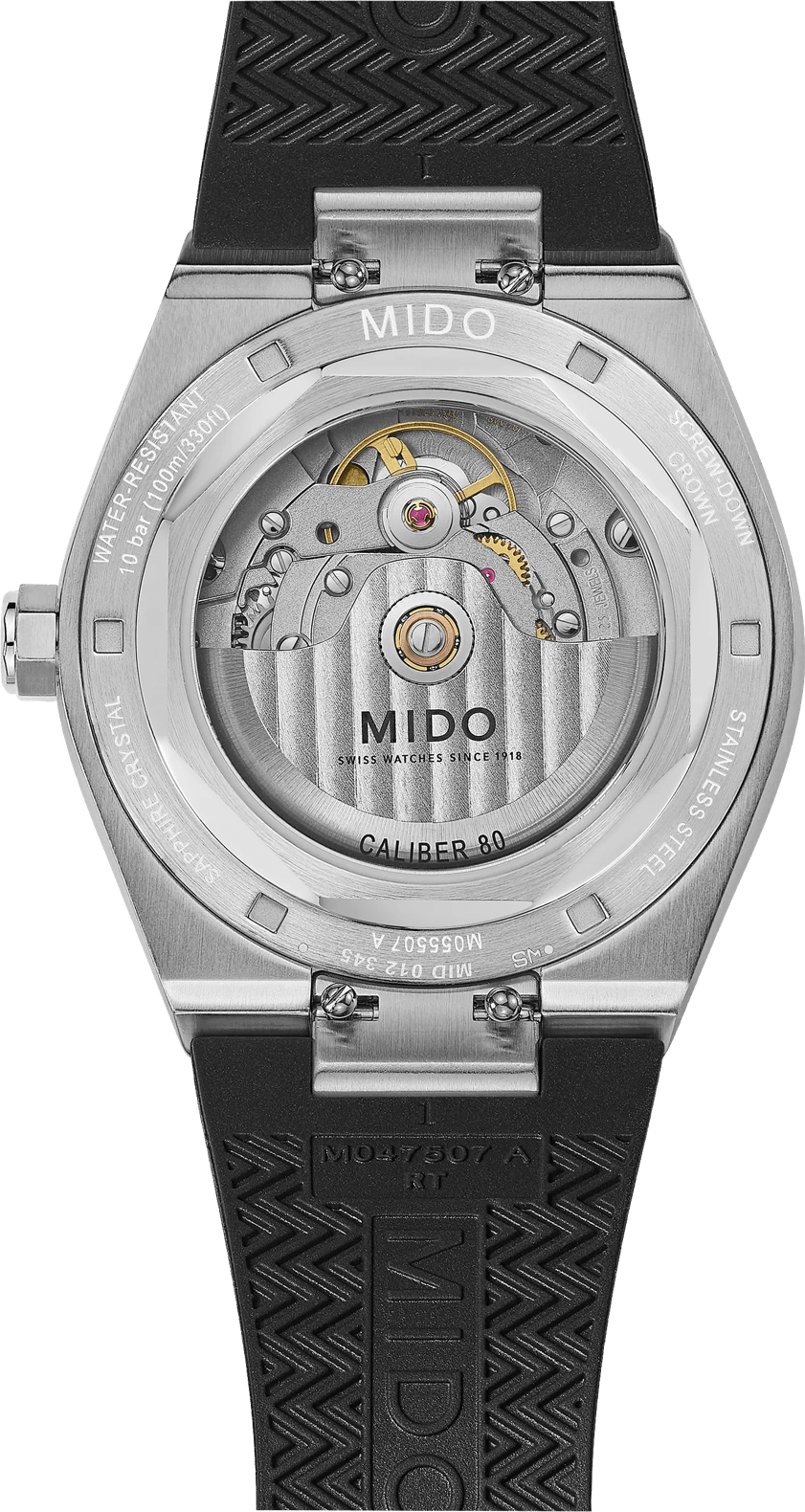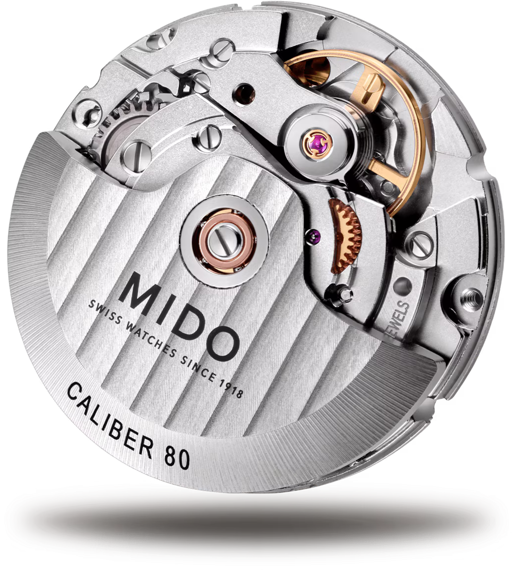 Funkce:Čas, datum, strojek Mido Caliber 80 (25 kamenů), rezerva chodu 80 hodin, polokmity setrvačky 21.600 za hodinu = přesnost chodu 3 - 5 vteřin denně, automatický nátah (pohyb ruky) + ruční nátah (hodinky lze také natahovat i korunkou), průhledné zadní víčko pro náhled na strojek, svítící ručičky a indexy (luminiscence)