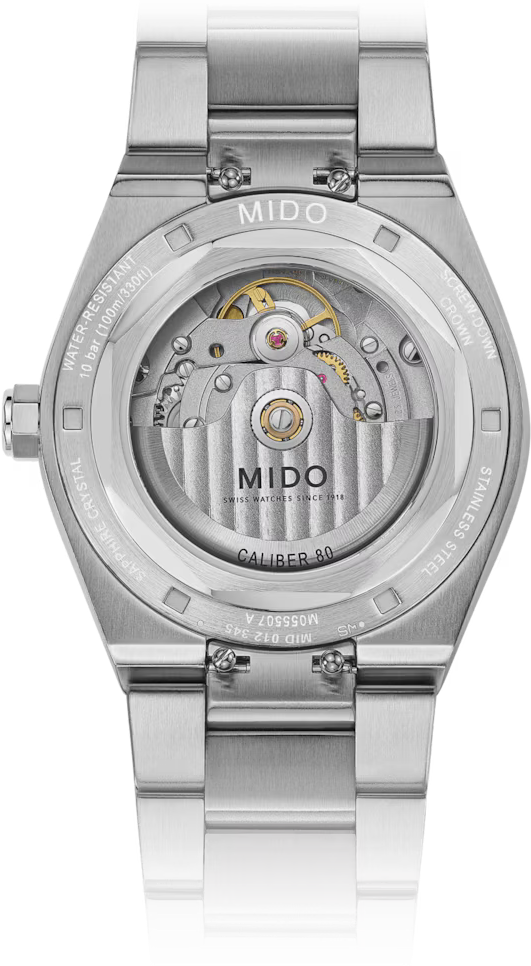 Funkce:Čas, datum, strojek Mido Caliber 80 (25 kamenů), rezerva chodu 80 hodin, polokmity setrvačky 21.600 za hodinu = přesnost chodu 3 - 5 vteřin denně, automatický nátah (pohyb ruky) + ruční nátah (hodinky lze také natahovat i korunkou), průhledné zadní víčko pro náhled na strojek, svítící ručičky a indexy (luminiscence)