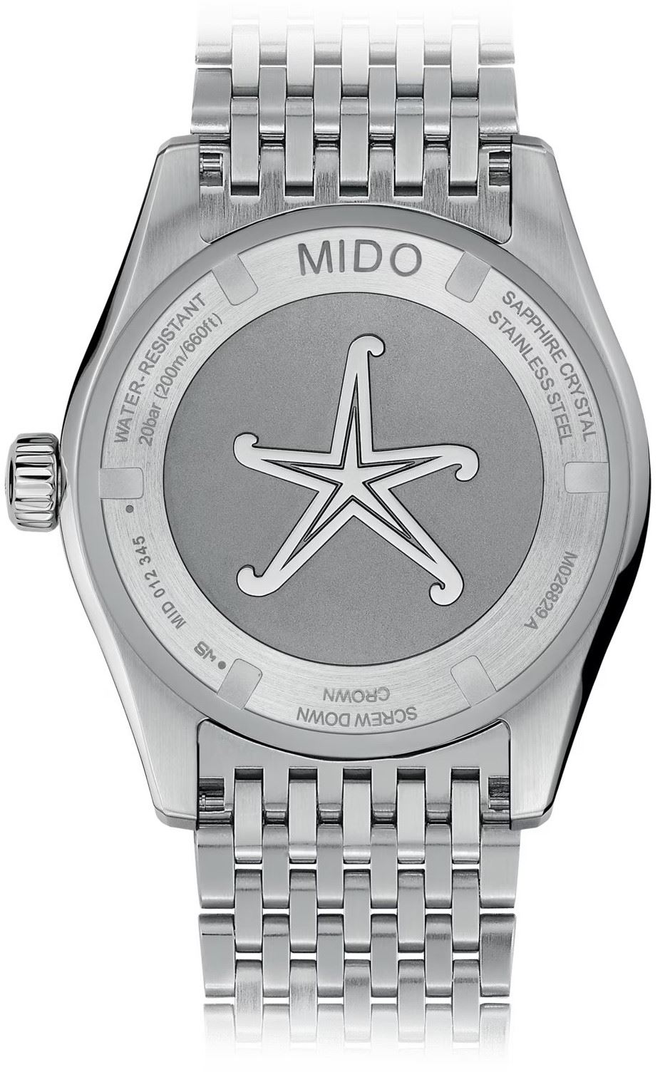 Funkce:Čas, datum, GMT, strojek swiss Automatic Mido Caliber 80 (base ETA C07.611) – 25 kamenů = rezerva chodu 80 hodin, polokmity setrvačky 21.600/h (3 Hz) = diference 3 - 5 vteřin denně (jemná regulace na věnci setrvačky), automat + ruční nátah, svítící ručičky a indexy (luminiscence)