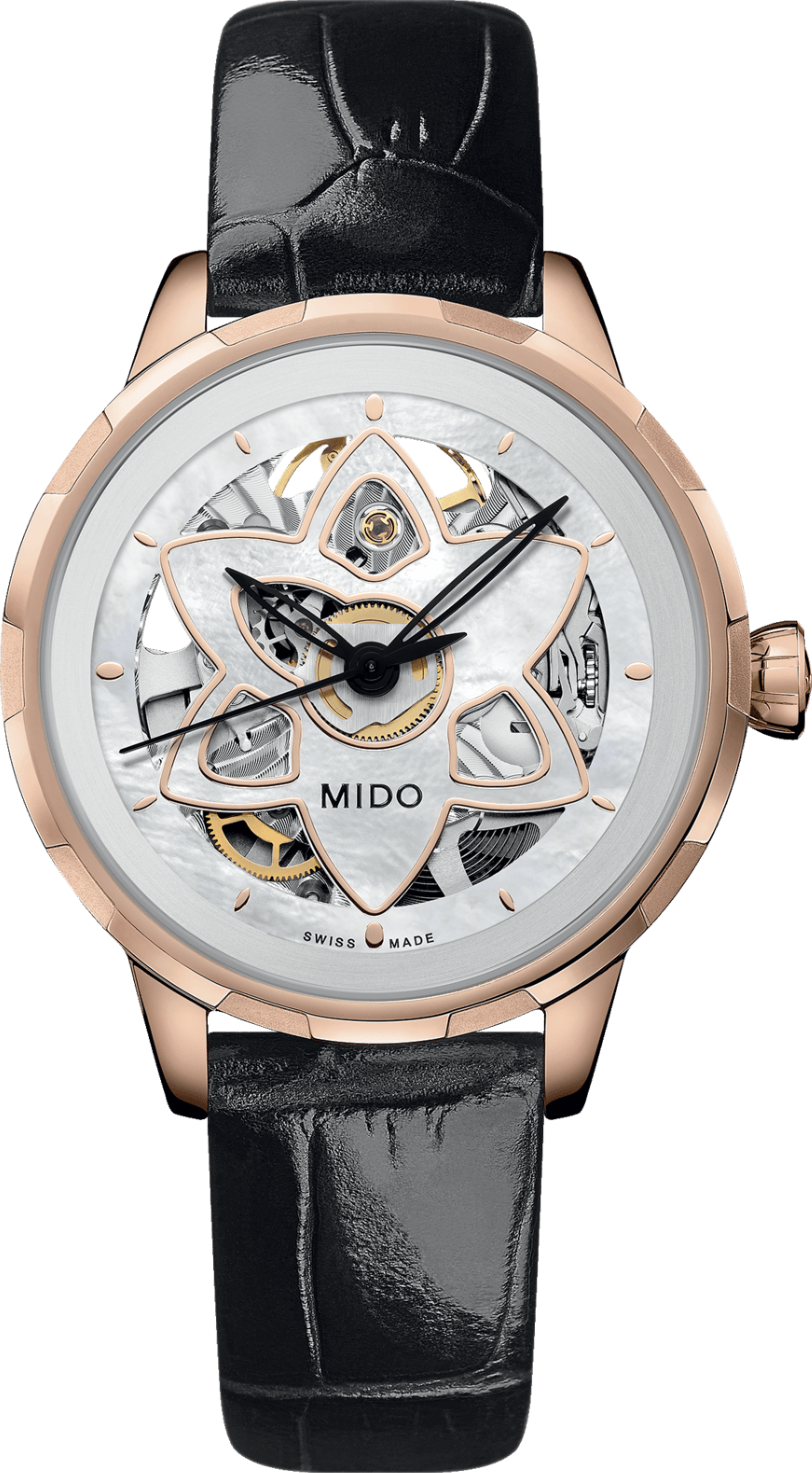 Firma Mido poprvé vytvořila skeletové švýcarské hodinky určené speciálně pro ženy. Nový a odvážný Rainflower Blossom M043.236.36.101.00 se vyznačuje jemnými liniemi, přímo inspirovanými tvarem lotosového květu současného singapurského ArtScience Museum. Po okrajích jsou propleteny rozhodně ženské okvětní lístky. Podmanivý číselník zdobený prolamovanou květinou odhaluje ve svém středu Calibre 80 – automatický strojek nejnovější generace, jehož hlavní základna byla speciálně skeletonizována a zdobena. Zve nositele, aby žasl nad plynoucím časem s odvahou a elegancí.