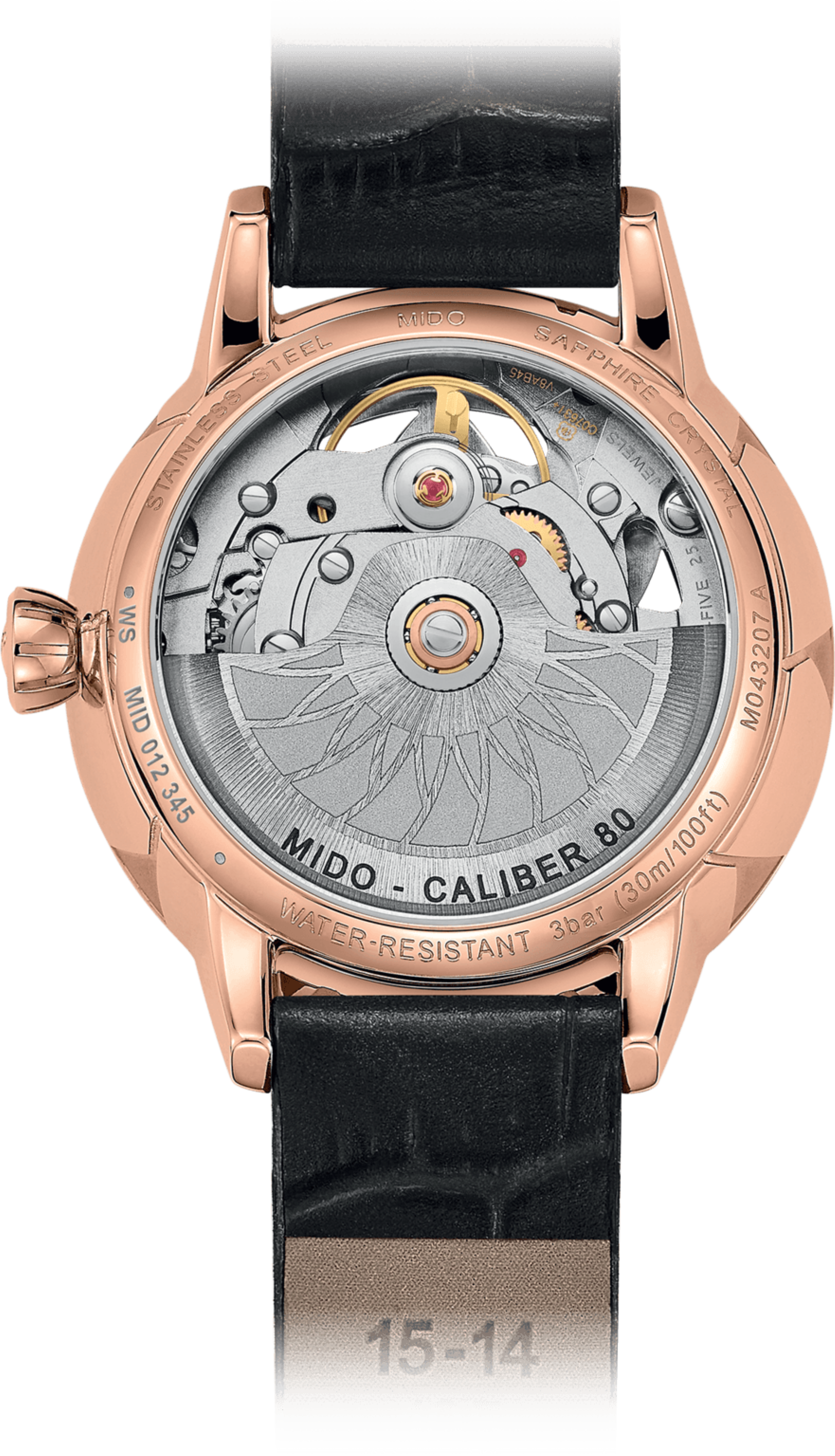Hodinky jsou osazeny vynikajícím strojkem švýcarské výroby Mido Caliber 80 s nadprůměrnou rezervou chodu 80 hodin. V praxi to znamená, že jsou-li hodinky plně nataženy a odložíme-li je např. v pátek na stůl, v pondělí ráno nám jdou a ukazují přesný čas. Rezerva chodu 80 hodin je velmi komfortní a má pozitivní vliv i na stabilitu přesnosti chodu.