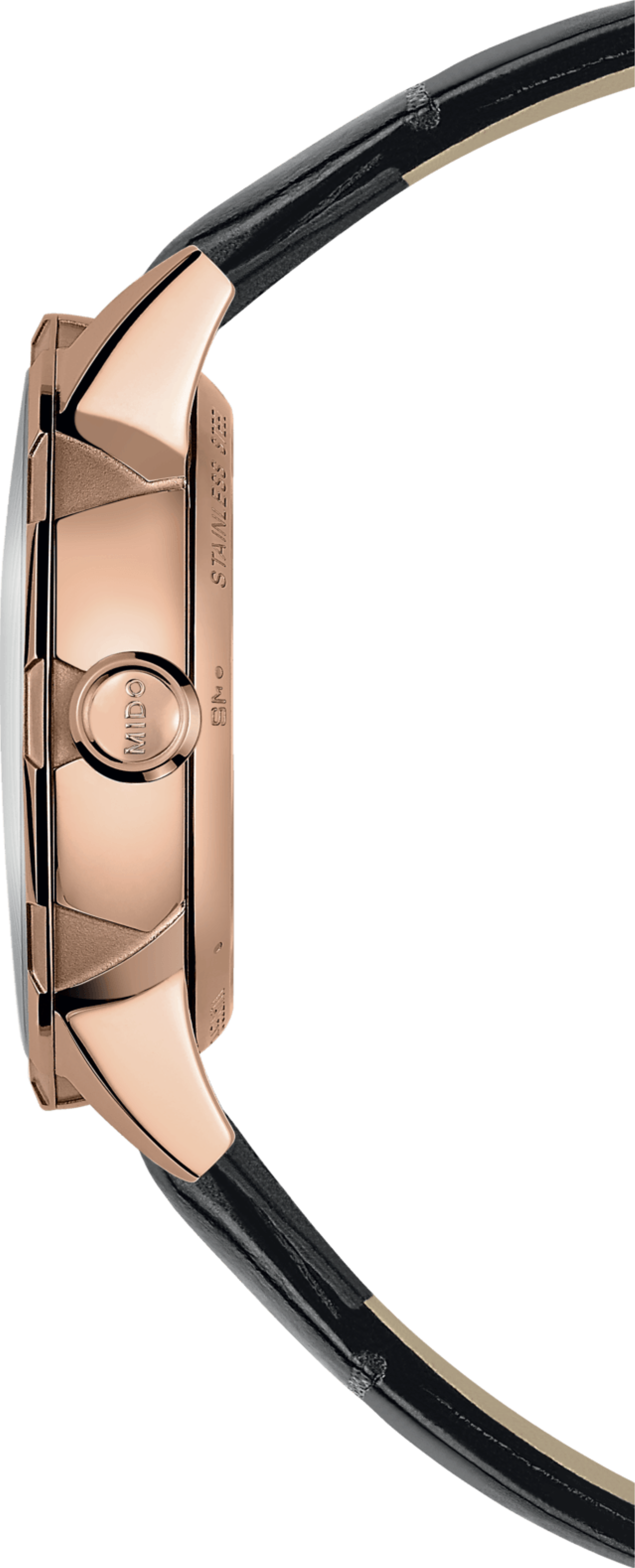 Funkce:Čas, strojek swiss Mido caliber 80 (základ ETA C07.631) - vyráběn firmou Eta exklusivně pro Mido = 25 kamenů (krokové ústrojí ocel/kámen), rezerva chodu 80 hodin, polokmity setrvačky 21.600/h = přesnost chodu 3 - 5 vteřin denně (nižší polokmity setrvačky jsou vyladěny jemnou regulací na věnci setrvačky pro maximální přesnost strojku), ozdobně lapovaný rotor samonátahu, automatický nátah (pohyb ruky) + ruční nátah (hodinky lze také natahovat i korunkou), průhledné zadní víčko pro náhled na strojek