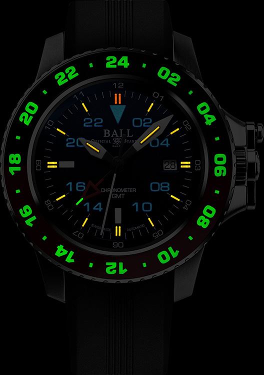 Funkce:Čas, datum, GMT (druhý světový čas), strojek Ball calibre RR1201 (základ swiss Eta 2892) - rezerva chodu 42 hodin (+ ruční nátah), 28.800 polokmitů setrvačky za hodinu, COSC certifikát přesnosti strojku - přesnost chodu 0 - 3 vteřiny/den, 21 kamenových uložení, jednosměrně otočná luminiscenční luneta, svítící ručky a indexy, patentovaný systém ochrany korunky, odolnost nárazu 7 500 Gs = možný pád hodinek až z jednoho a půl metru bez poškození strojku (hodinky jsou tímto zároveň odolné nárazům identické síly), odolnost vůči magnetickému poli 4 800 A/m (takto označené hodinky už se označují jako antimagnetické, odolávají běžnému magnetickému poli). V číselníku jsou indexy a ručičky plněny mikroampulkami se svítícím plynem, který má schopnost svítit nonstop 25 let. Díky tomu uvidíte kdykoliv a kdekoliv ve tmě, jaký je správný čas