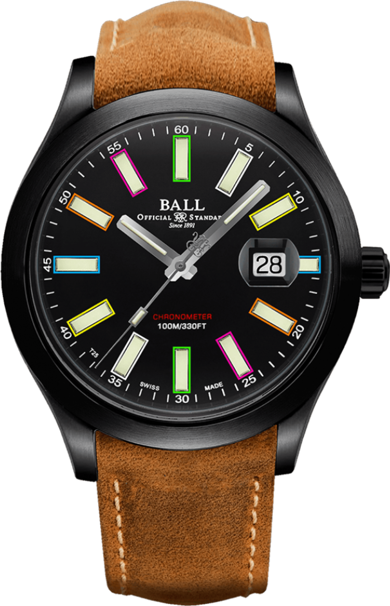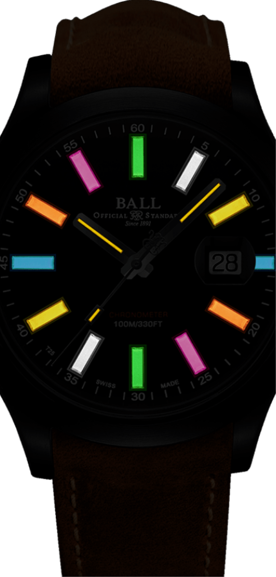 Funkce:Čas, datum, šroubovací korunka, strojek Ball calibre RR1103-C (základ swiss Eta 2824) - rezerva chodu 38 hodin(+ ruční nátah), 28.800 polokmitů setrvačky za hodinu, COSC certifikát přesnosti strojku - přesnost chodu 0 - 3 vteřiny / den, 26 kamenových uložení, odolnost nárazu 5 000Gs = možný pád hodinek až z jednoho metru bez poškození strojku (hodinky jsou tímto zároveň odolné podobným nárazům identické síly, odolnost vůči magnetickému poli 4 800 A/m (takto označené hodinky už se označují jako antimagnetické, odolávají běžnému magnetickému poli). V číselníku jsou indexy a ručičky plněny svítícím plynem, který má schopnost svítit nonstop 25 let. Díky tomu uvidíte kdykoliv a kdekoliv ve tmě, jaký je správný čas.