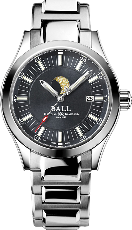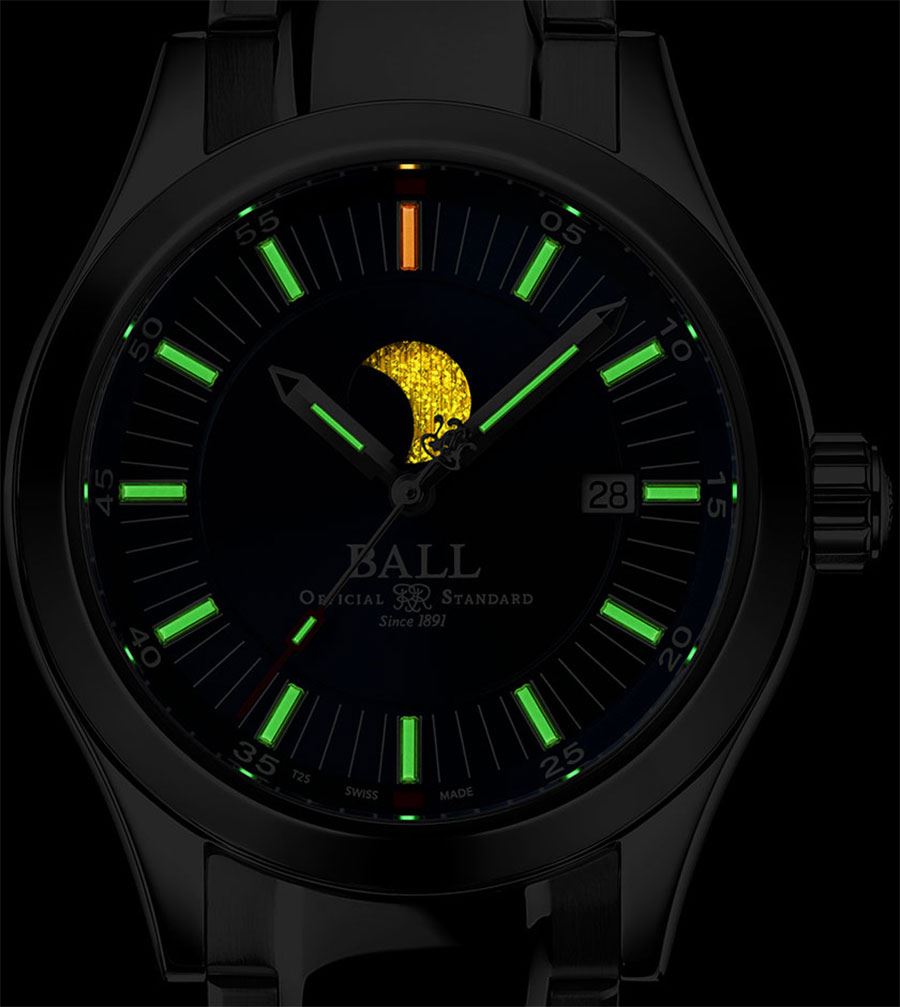 Funkce:Čas, datum, fáze měsíce, šroubovací korunka, strojek Ball calibre RR1801 (základ swiss Eta 2892) - rezerva chodu 42 hodin(+ ruční nátah), 28.800 polokmitů setrvačky za hodinu - přesnost chodu 3 - 4 vteřiny denně, 25 kamenových uložení, odolnost nárazu 5 000Gs = možný pád hodinek až z jednoho metru bez poškození strojku (hodinky jsou tímto zároveň odolné podobným nárazům identické síly), odolnost vůči magnetickému poli 4 800 A/m (takto označené hodinky už se označují jako antimagnetické, odolávají běžnému magnetickému poli). V číselníku jsou indexy a ručičky plněny svítícím plynem, který má schopnost svítit nonstop 24 hodin. Díky tomu uvidíte kdykoliv a kdekoliv ve tmě, jaký je správný čas.