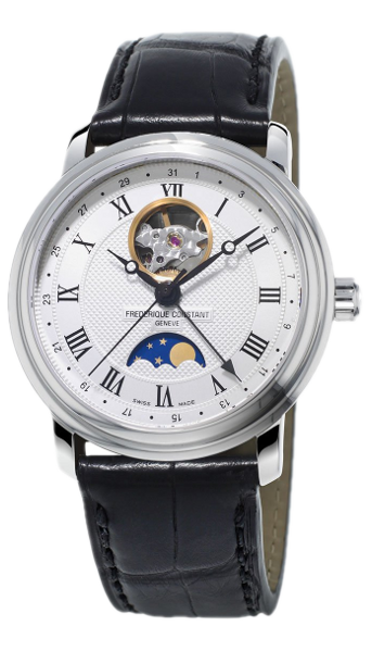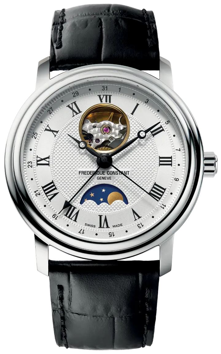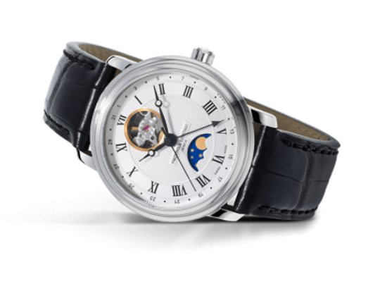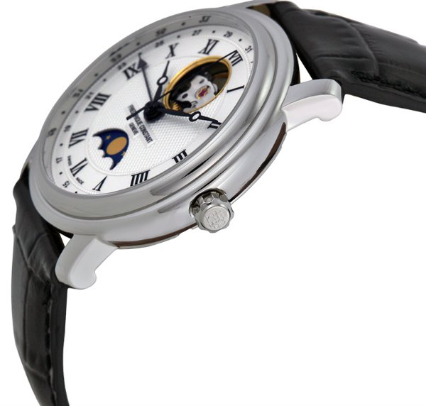 Funkce:Čas, fáze měsíce, strojek FC-335 (Eta 2824 s nástavbou) - 26 kamenů - rezerva chodu 38 hodin, kmity setrvačky 28.800/h = diference 3 - 4 vteřiny denně, otevřené srdce strojku, průhledné zadní víčko pro náhled na strojek, překlápěcí spona pásku (motýlková)