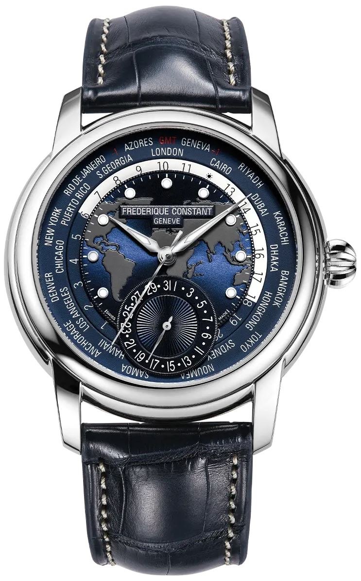 Funkce:Čas, datum, světové časy, strojek FC-718 (vlastní výroba Frederique Constant), 26 kamenů - rezerva chodu 38 - 40 hodin, polokmity setrvačky 28.800/h = diference 2 - 4 vteřiny denně, průhledné zadní víčko pro náhled na strojek