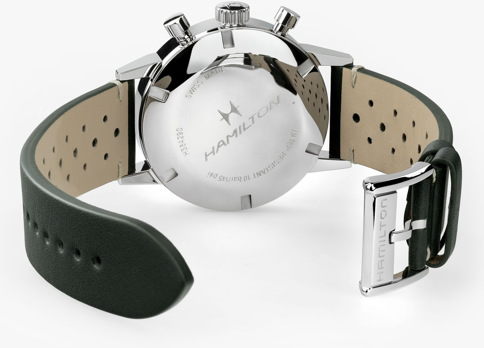 Funkce:Čas, chronograf = stopky, mechanický strojek Swiss calibre H-21 Intra-Matic Chronograph H (základ Eta Valjoux 7750 - 25 kamenů) - vyráběn firmou Eta exklusivně pro Hamilton, vlásek setrvačky je vyroben z materiálu Nivachron - velmi dobře odolává magnetickému poli (až 20x odolnější vůči magnetickému poli jak klasický slitinový vlásek) a díky tomu jsou hodinky přesnější a stabilnější v chodu, rezerva chodu 60 hodin, polokmity setrvačky 28.800/h = přesnost chodu 2 - 4 vteřiny denně, krokové ústrojí ocel/kámen, ruční nátah (hodinky se nařizují a natahují ručně korunkou), průhledné zadní víčko pro náhled na strojek, svítící ručičky a indexy (ručičky a indexy jsou potaženy luminiscenční vrstvou Super-LumiNova®, která po nasvícení dlouhou dobu svítí)