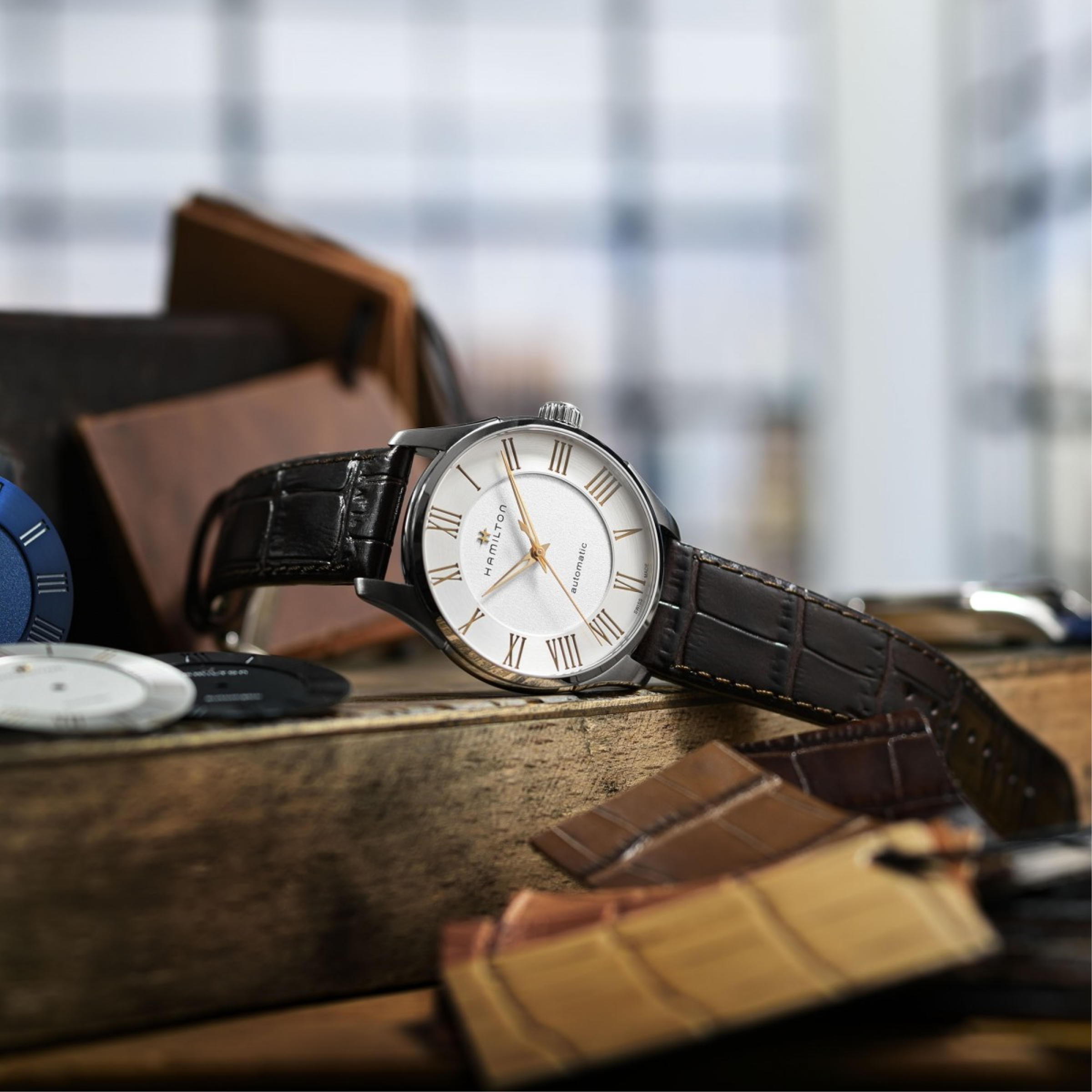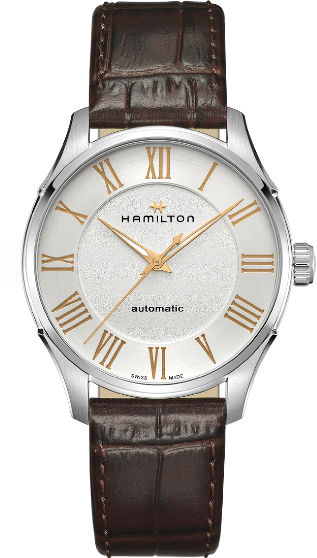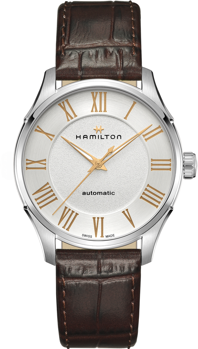 Funkce:Čas, strojek swiss kalibr H-10 - vyráběn firmou Eta exklusivně pro Hamilton = 25 kamenů (krokové ústrojí ocel/kámen), rezerva chodu 80 hodin, polokmity setrvačky 21.600/h = přesnost chodu 3 - 5 vteřin denně (nižší polokmity setrvačky jsou vyladěny jemnou regulací pro maximální přesnost strojku na věnci setrvačky), úprava rotoru samonátahu dle vzoru Hamilton - rotor zaopatřen speciálními výřezy na tlumení případných nárazů hodinek během nošení, automatický nátah (pohyb ruky) + ruční nátah (hodinky lze také natahovat i korunkou), svítící ručičky (luminiscence)