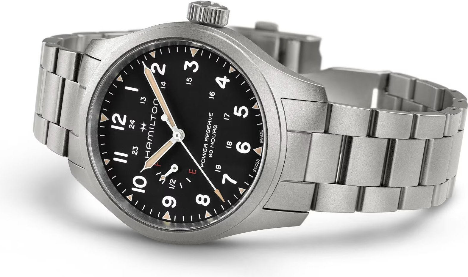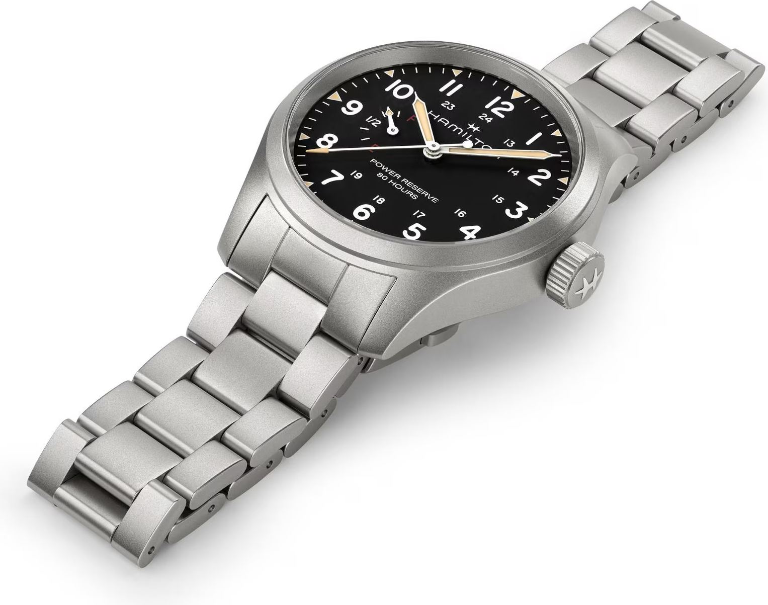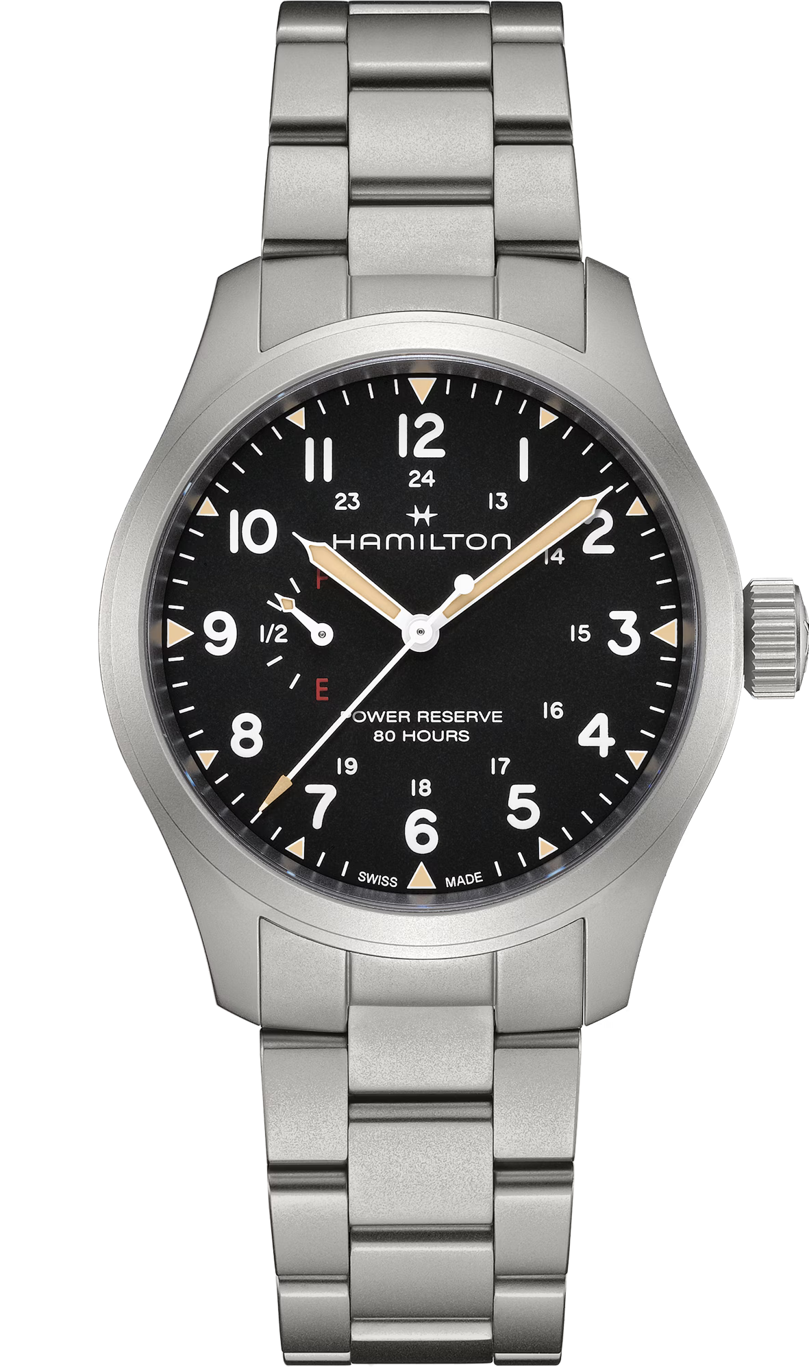 Funkce:Čas, kalibr H-23 - ETA jej vyvinula speciálně pro Hamilton jako manuálně natahovaný strojek s ukazatelem rezervy chodu, 24 kamenových uložení, rezerva chodu 80 hodin, polokmity setrvačky 21.600/h = přesnost chodu 3 - 5 vteřin denně (vysoké přesnosti stroje je docíleno jemnou regulací šroubky na ramínkách věnce setrvačky), pouze ruční nátah korunkou, svítící ručičky a indexy (ručičky a indexy jsou potaženy luminiscenční vrstvou Super-LumiNova®, která po nasvícení dlouhou dobu svítí)