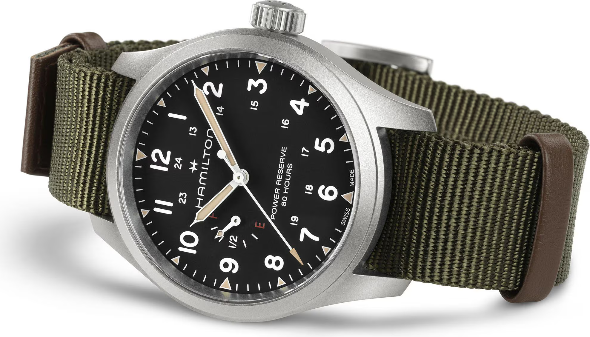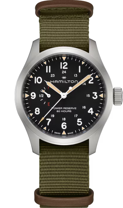 Funkce:Čas, kalibr H-23 - ETA jej vyvinula speciálně pro Hamilton jako manuálně natahovaný strojek s ukazatelem rezervy chodu, 24 kamenových uložení, rezerva chodu 80 hodin, polokmity setrvačky 21.600/h = přesnost chodu 3 - 5 vteřin denně (vysoké přesnosti stroje je docíleno jemnou regulací šroubky na ramínkách věnce setrvačky), pouze ruční nátah korunkou, svítící ručičky a indexy (ručičky a indexy jsou potaženy luminiscenční vrstvou Super-LumiNova®, která po nasvícení dlouhou dobu svítí)