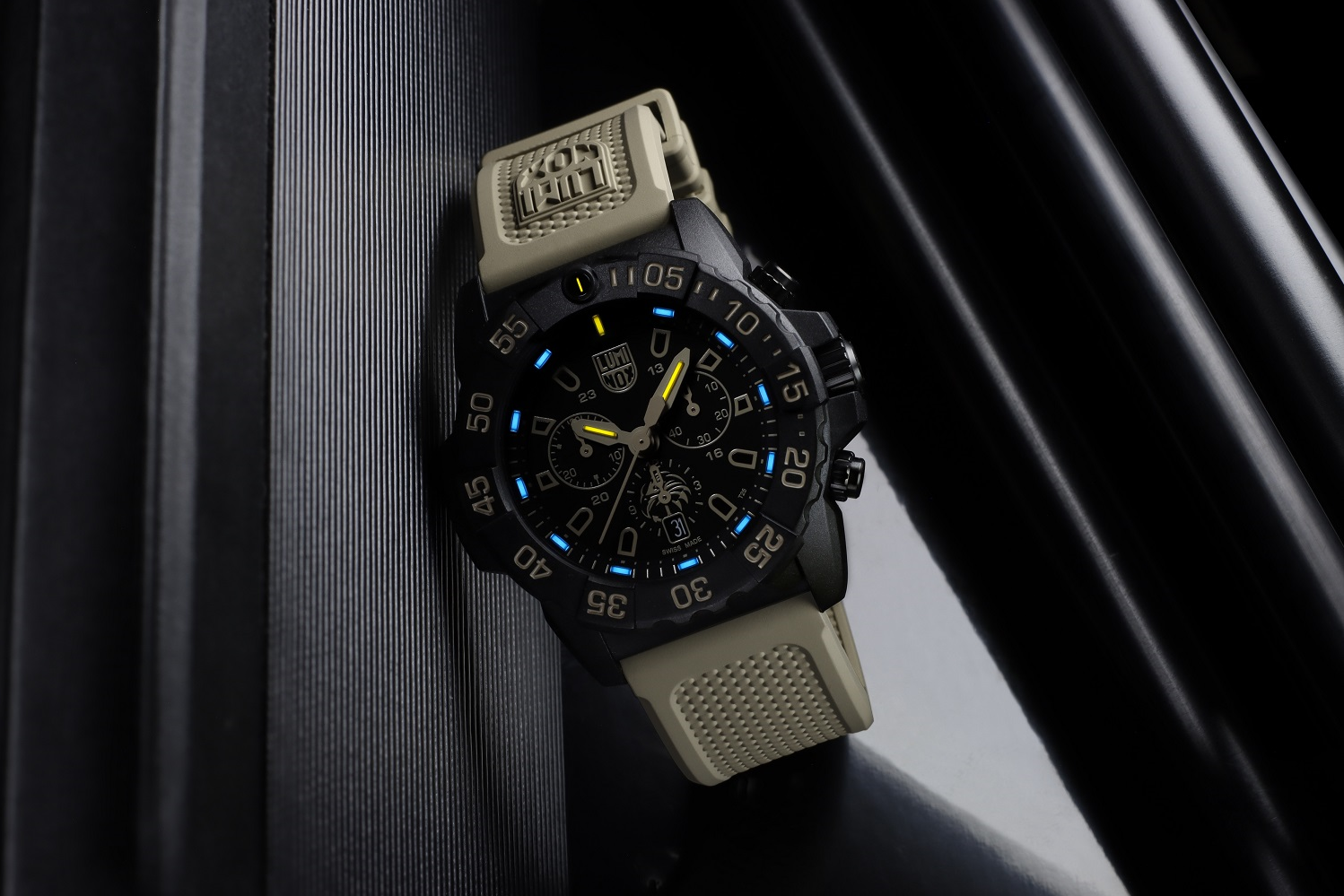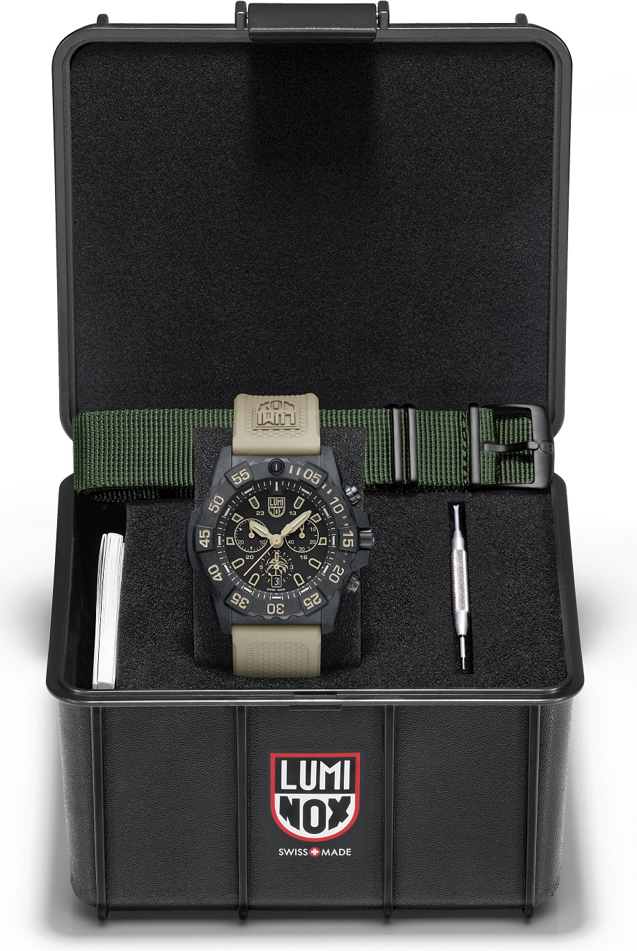 Funkce:Čas, datum, švýcarský quartzový chronograf Ronda 5030.D, jednosměrně otočná luneta, noční osvětlení Luminox Light Technology, dvojité bezpečnostní těsnění korunky a šroubovací zadní víčko, dodáváno v setu s textilním páskem pro rychlou výměnu
