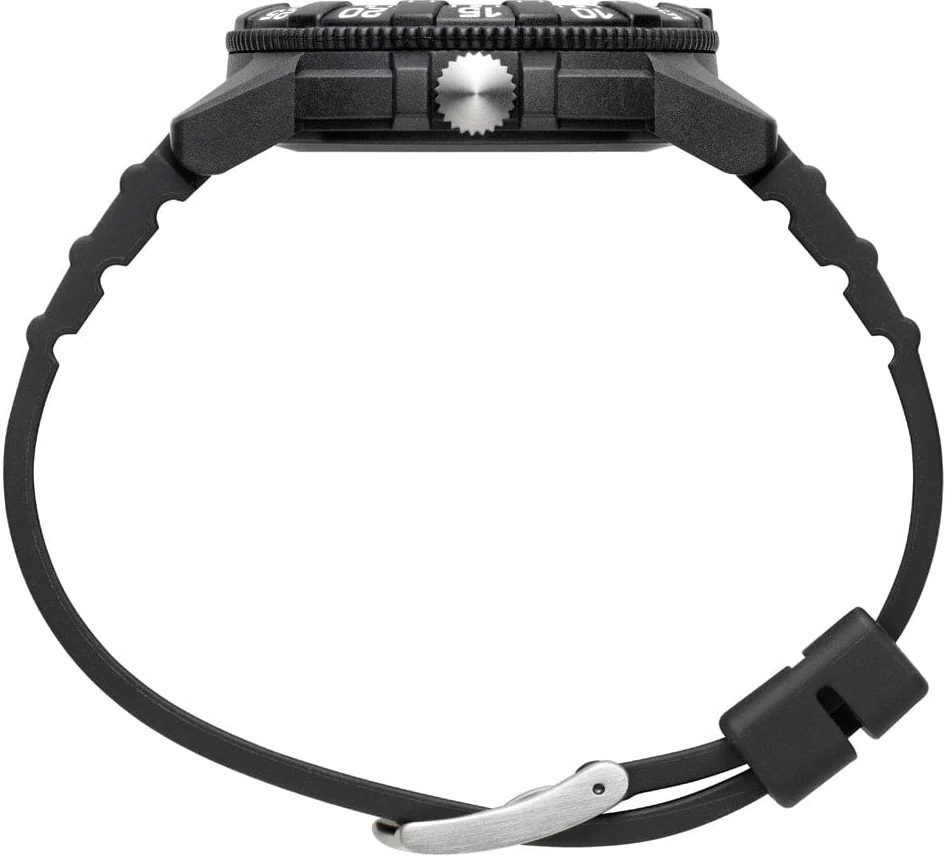 Číselník této reference je podle ověřených prodejních zdrojů černý a kromě standardního zobrazení času nabízí také ukazatel data a 24hodinový formát, což zvyšuje jeho praktičnost. Právě kombinace hlavní hodinové stupnice a vnitřního 24hodinového značení dává modelu techničtější charakter a zlepšuje orientaci. Důležitým konstrukčním prvkem je jednosměrně otočná luneta s minutovou stupnicí, která odpovídá sportovnímu a potápěčsky inspirovanému zaměření kolekce. Přední stranu chrání tvrzené minerální sklíčko, v některých parametrech uváděné jako minerální K1. O noční čitelnost se stará Luminox Light Technology, která i u této reference zajišťuje dlouhodobou viditelnost za tmy bez potřeby nasvícení. Čelní strana XS.0329.1 tak působí funkčně, čistě a technicky. Nejde o model, který by stál na výrazném barevném detailu, ale na kombinaci přehlednosti a praktičnosti. To je u sportovních hodinek této kategorie velmi silný argument, protože právě jednoduchost a dobrá orientace bývají v reálném používání důležitější než efektní design.
