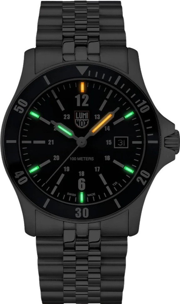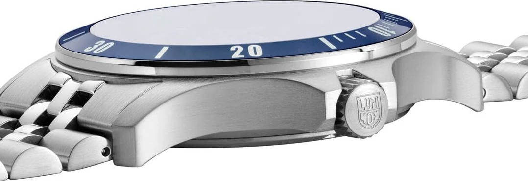Číselník této reference má modrý sunray odstín, tedy slunečním brusem oživenou modrou plochu, která na světle jemně mění výraz a dodává hodinkám větší vizuální hloubku. Datum je umístěno na 3. hodině, takže čelní strana zůstává čistá a přehledná. Důležitým konstrukčním i designovým prvkem je pevná ocelová luneta s modrou hliníkovou vložkou, která navazuje na barvu číselníku a dává modelu kompaktnější, méně kontrastní vzhled než u verze XS.0914. Přední stranu chrání safírové sklíčko s antireflexní vrstvou. Safírové sklíčko vyniká vysokou odolností proti poškrábání, což je u každodenně nošených hodinek velmi důležitý parametr. Ručky a indexy jsou osazeny 8 trubičkami Luminox Light Technology, které zajišťují čitelnost za tmy po dobu až 25 let bez nutnosti předchozího nasvícení. Právě LLT je jedním z hlavních důvodů, proč mají hodinky Luminox tak silné postavení mezi zákazníky, kteří vyžadují trvalou čitelnost v jakýchkoli světelných podmínkách. Čelní strana modelu XS.0913 díky tomu spojuje sportovní funkčnost, velmi dobrou přehlednost a kultivovaně moderní vzhled.