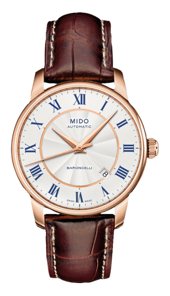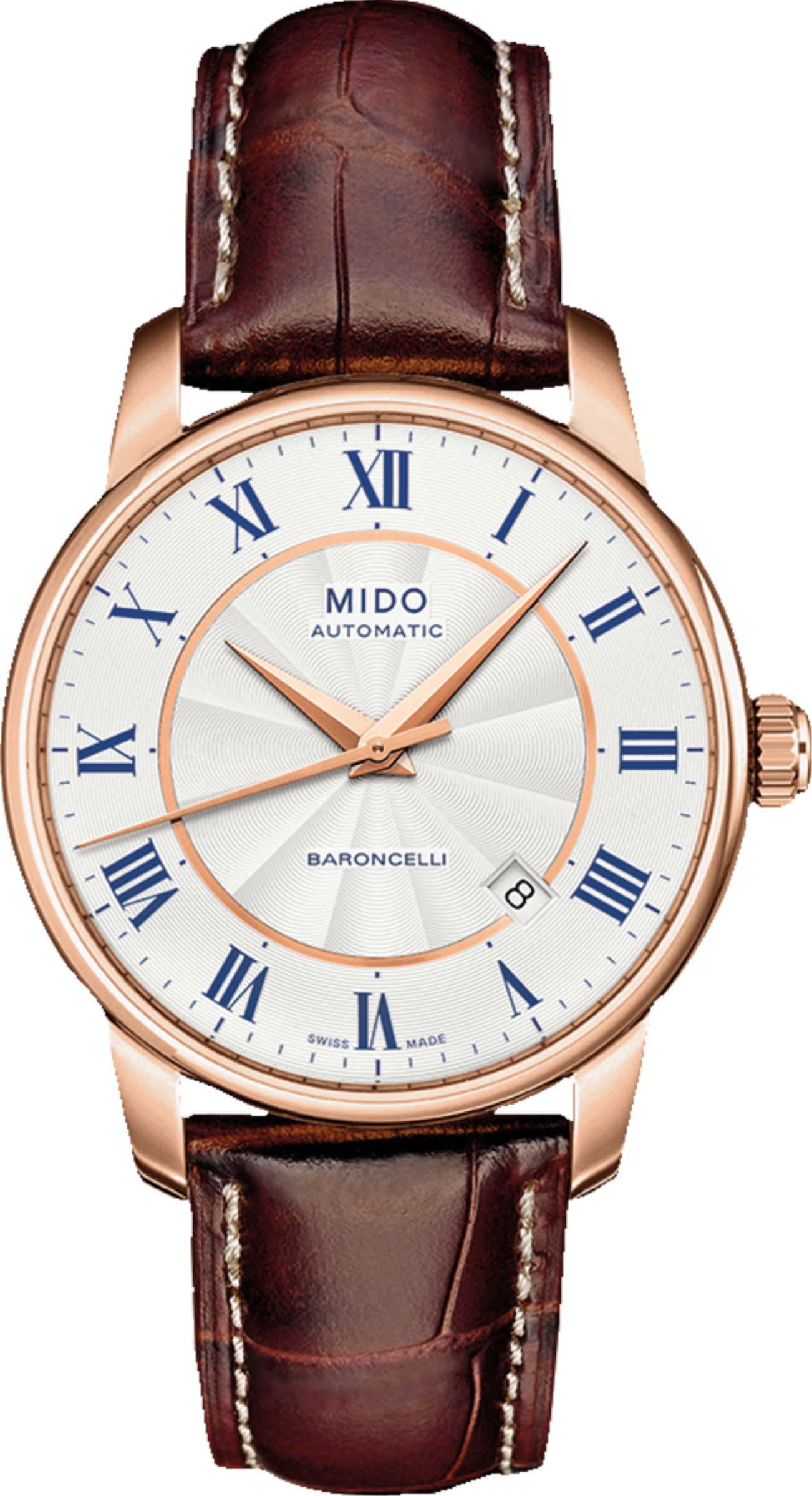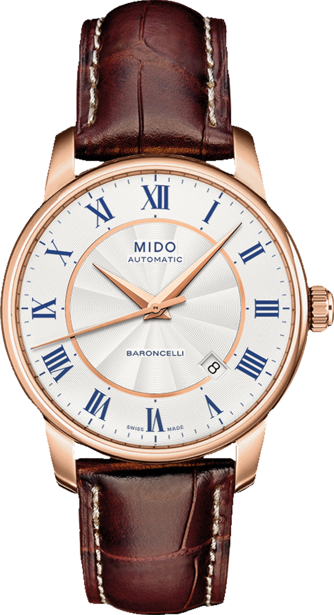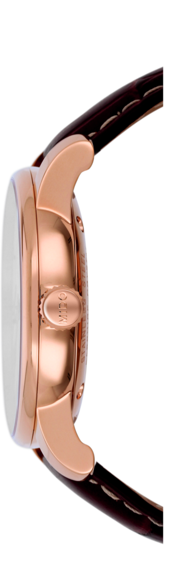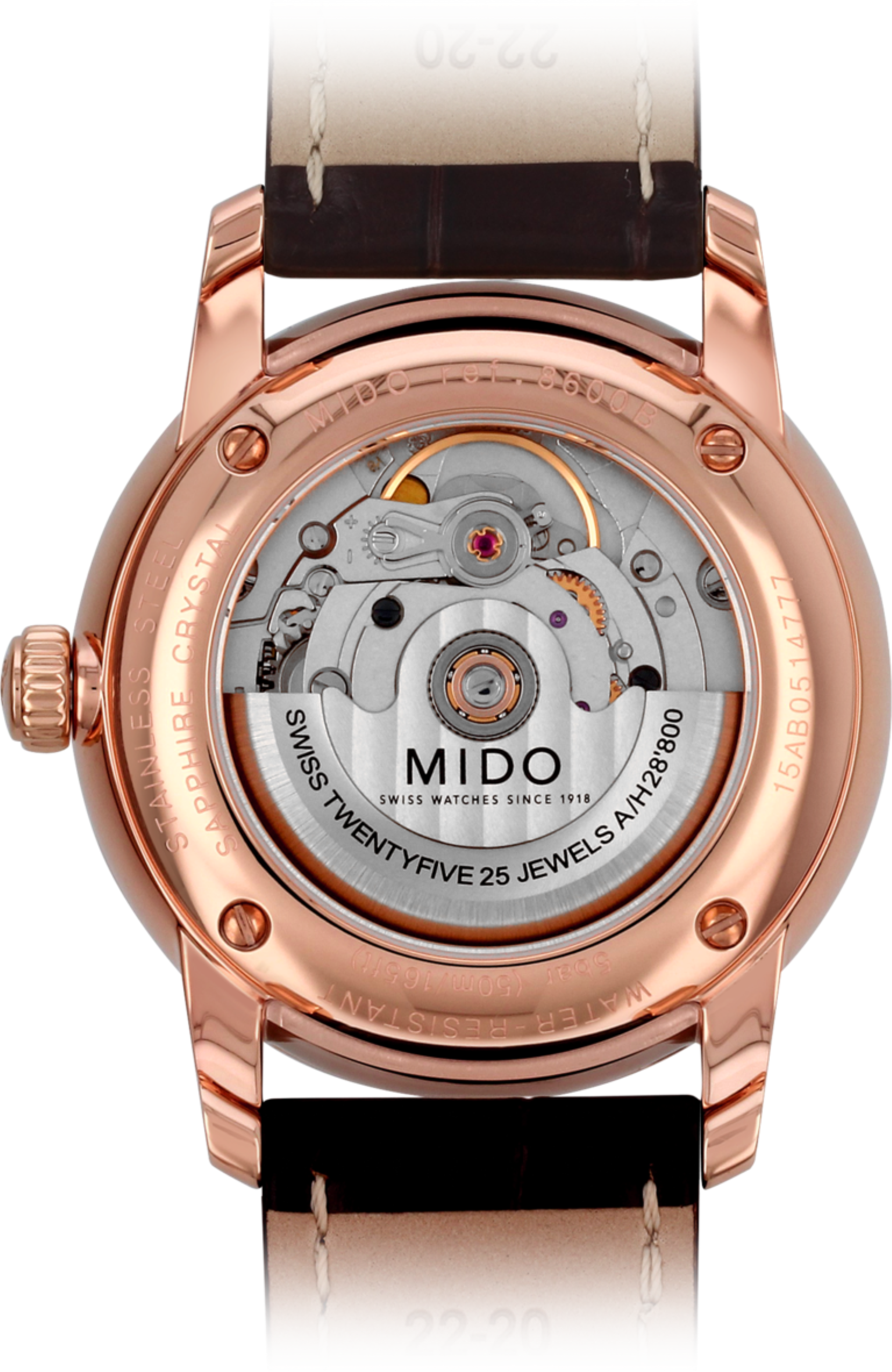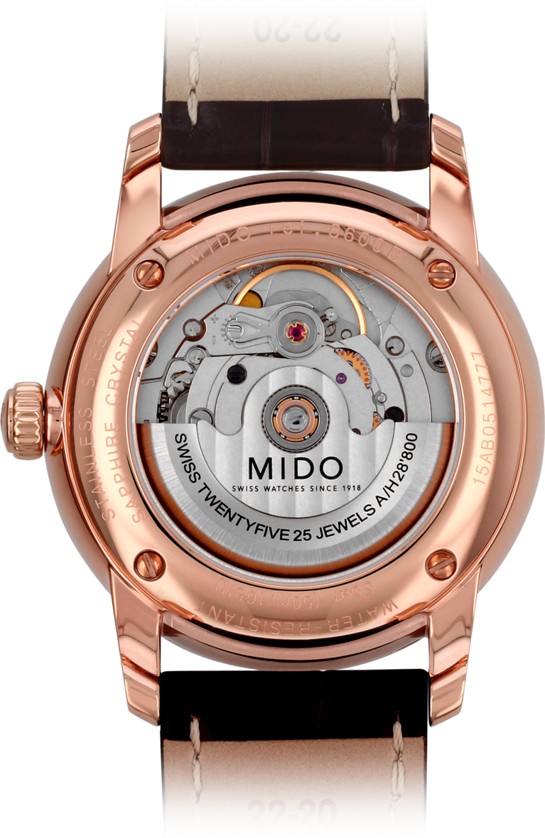 Funkce:Čas, datum, strojek swiss Mido caliber 80 (Eta C07.611) - vyráběn firmou Eta exklusivně pro Mido = 25 kamenů (krokové ústrojí ocel/kámen), rezerva chodu 80 hodin, polokmity setrvačky 21.600/h = přesnost chodu 3 - 5 vteřin denně (nižší polokmity setrvačky jsou vyladěny jemnou regulací na věnci setrvačky pro maximální přesnost strojku), ozdobně lapovaný rotor samonátahu, automatický nátah (pohyb ruky) + ruční nátah (hodinky lze také natahovat i korunkou), průhledné zadní víčko pro náhled na strojek, nárazuvzdorné
