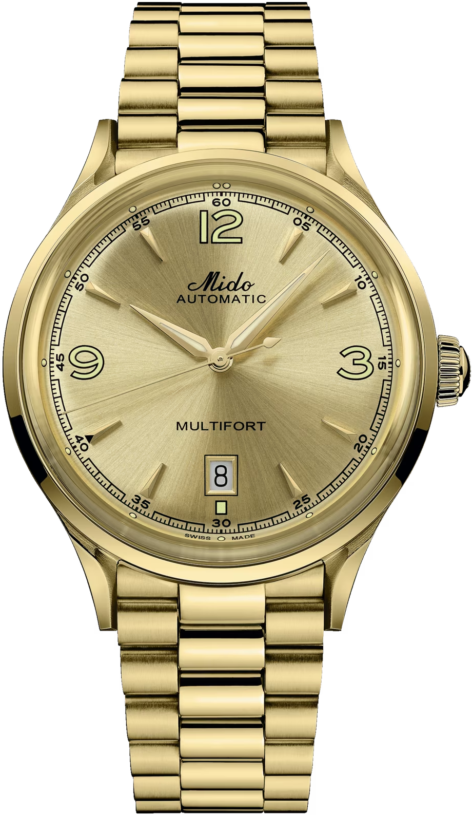 Funkce:Čas, datum, strojek swiss Mido caliber 80 (Eta C07.621) - vyráběn firmou Eta exklusivně pro Mido = 25 kamenů (krokové ústrojí ocel/kámen), rezerva chodu 80 hodin, polokmity setrvačky 21.600/h = přesnost chodu 3 - 5 vteřin denně (nižší polokmity setrvačky jsou vyladěny jemnou regulací na věnci setrvačky pro maximální přesnost strojku), ozdobně lapovaný rotor, automatický nátah (pohyb ruky) + ruční nátah (hodinky lze také natahovat i korunkou), vlásek setrvačky je vyroben z Nivachronu, ručičky a indexy jsou opatřené luminiscenční vrstvou (po nasvícení dlouhou dobu svítí)