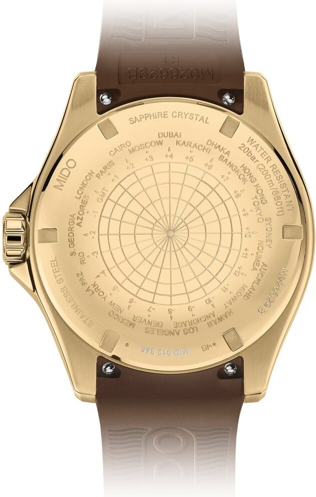 Funkce:Čas, datum, strojek swiss Mido caliber 80 (Eta C07.661) - vyráběn firmou Eta exklusivně pro Mido = 25 kamenů (krokové ústrojí ocel/kámen), rezerva chodu 80 hodin, polokmity setrvačky 21.600/h = přesnost chodu 3 - 5 vteřin denně (nižší polokmity setrvačky jsou vyladěny jemnou regulací na věnci setrvačky pro maximální přesnost strojku), ozdobně lapovaný rotor samonátahu, automatický nátah (pohyb ruky) + ruční nátah (hodinky lze také natahovat i korunkou), ručičky a indexy jsou opatřeny vrstvou Super-LumiNova (svit v noci i za šera)