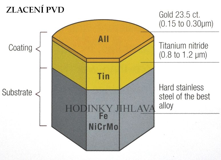 PVD je velmi tvrdá povrchová úprava kovů, v hodinářském průmyslu se nejčastěji používá na pouzdra a náramky. Nitrid titanu se ve vakuu nanáší na naprosto čistý a odmaštěný povrch, někdy i v několika vrstvách. Obvyklá tloušťka vrstvy je 2 - 5 μm (mikrónů) - čím je tato vrstva silnější, tím lépe odolává opotřebení. PVD lze aplikovat na základní kov v několika odstínech, např. žluté zlato (yellow gold), růžové zlato (rose gold), černá, odstíny modré, červené, hnědé atd. PVD je odolná vůči běžnému nošení, je antikorozní a barevně stálá.