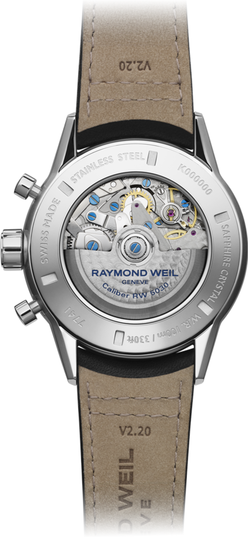 Funkce:Čas, datum, strojek In-house Swiss Raymond Weil RW5030 = rezerva chodu 56 hodin, 27 kamenových uložení, polokmity setrvačky 28.800/h (4 Hz) = diference 2 - 4 vteřiny denně, automatický nátah (hodinky se natahují pohybem ruky) + ruční nátah (hodinky lze natáhnout/dotáhnout i ručně korunkou), korunka pouzdra s logem RW (Raymond Weil), průhledné zadní víčko pro náhled na strojek