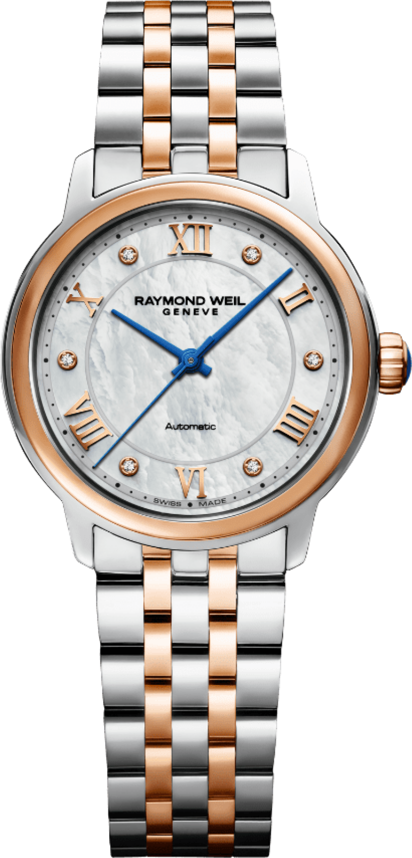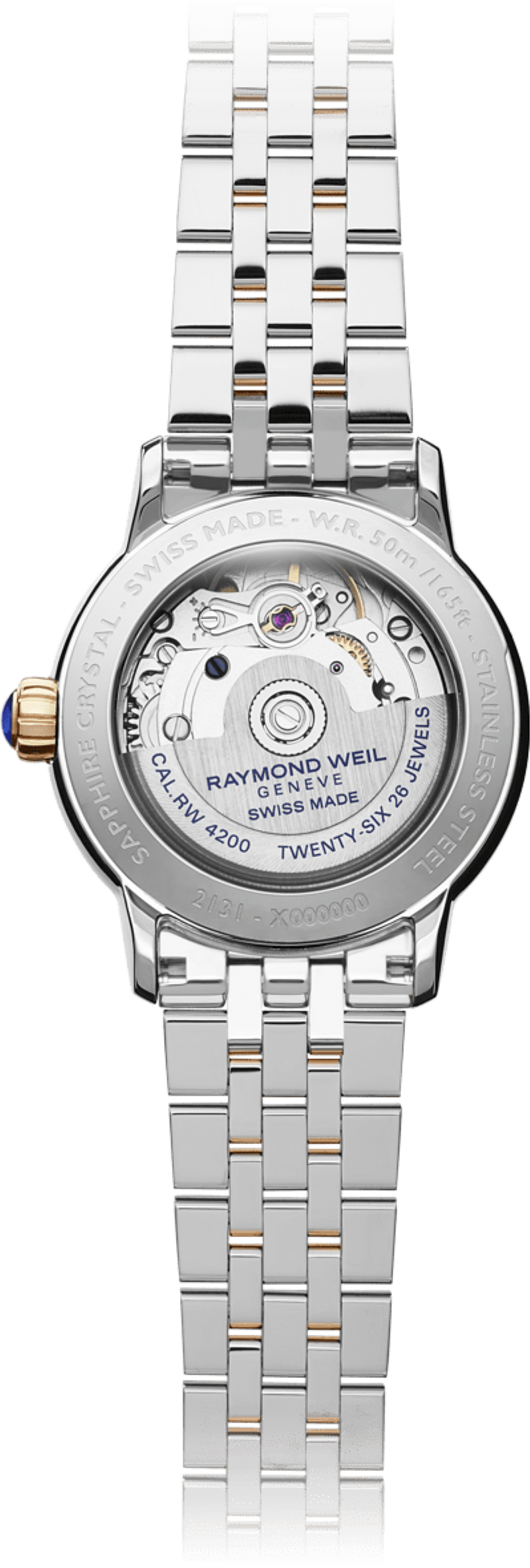 Funkce:Čas, strojek Swiss Raymond Weil 4200 (základ Sellita SW200-1) = rezerva chodu 38 hodin, 26 kamenových uložení, polokmity setrvačky 28.800/h (4 Hz) = diference 2 - 4 vteřiny denně, automatický nátah (hodinky se natahují pohybem ruky) + ruční nátah (hodinky lze natáhnout/dotáhnout i ručně korunkou), oboustranný nátah rotoru, korunka pouzdra s logem RW (Raymond Weil), průhledné zadní víčko pro náhled na strojek, číselník zdobí 5 diamantů (0,02 karátů)