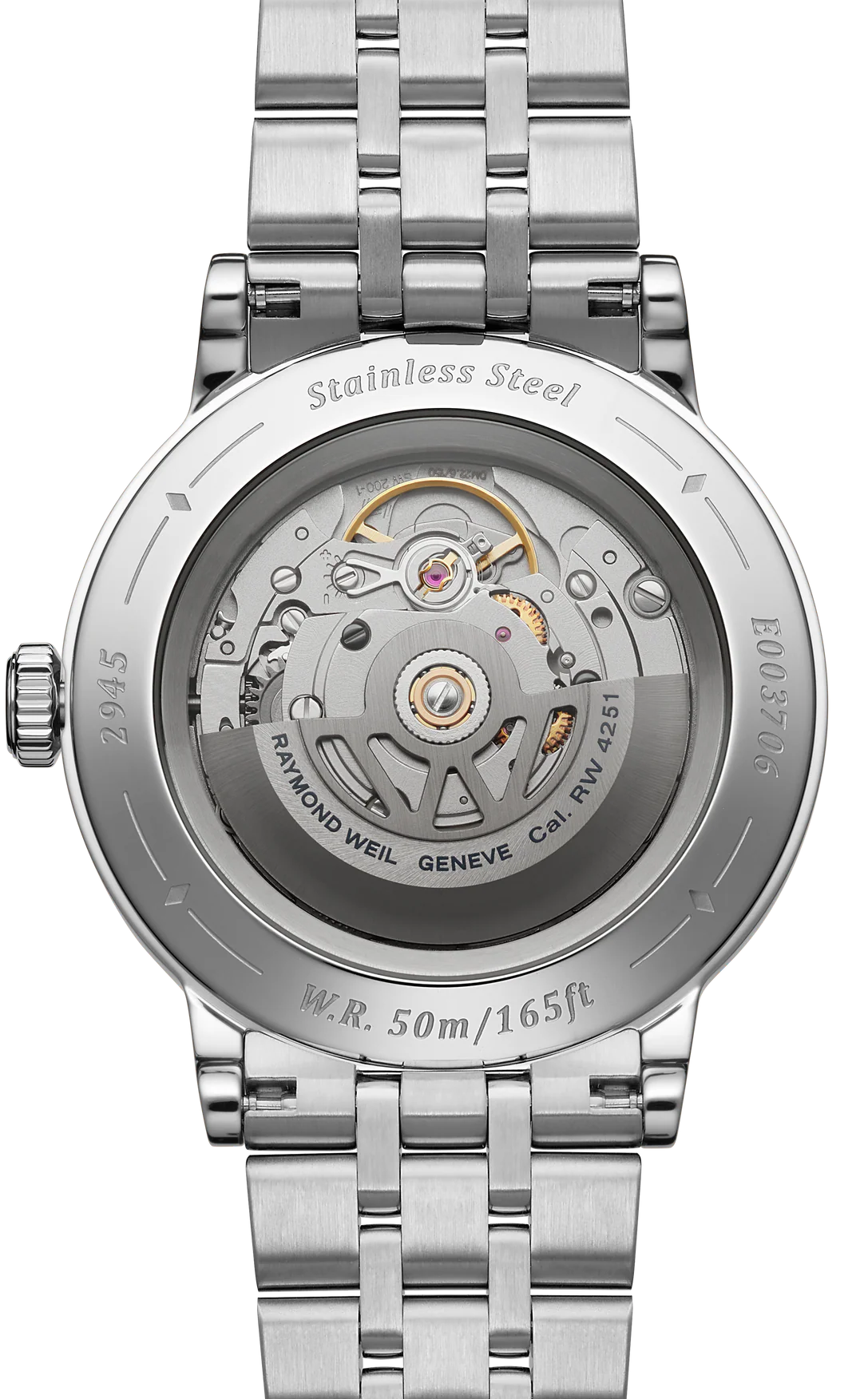 Funkce:Čas, měsíční fáze, strojek Swiss Raymond Weil 4280 (základ Sellita SW200-1) = rezerva chodu 41 hodin, 26 kamenových uložení, polokmity setrvačky 28.800/h (4 Hz)  = diference 2 - 4 vteřiny denně,  automatický nátah (hodinky se natahují pohybem ruky) + ruční nátah (hodinky lze natáhnout/dotáhnout i ručně korunkou), oboustranný nátah rotoru, korunka pouzdra s logem RW (Raymond Weil), průhledné zadní víčko pro náhled na strojek